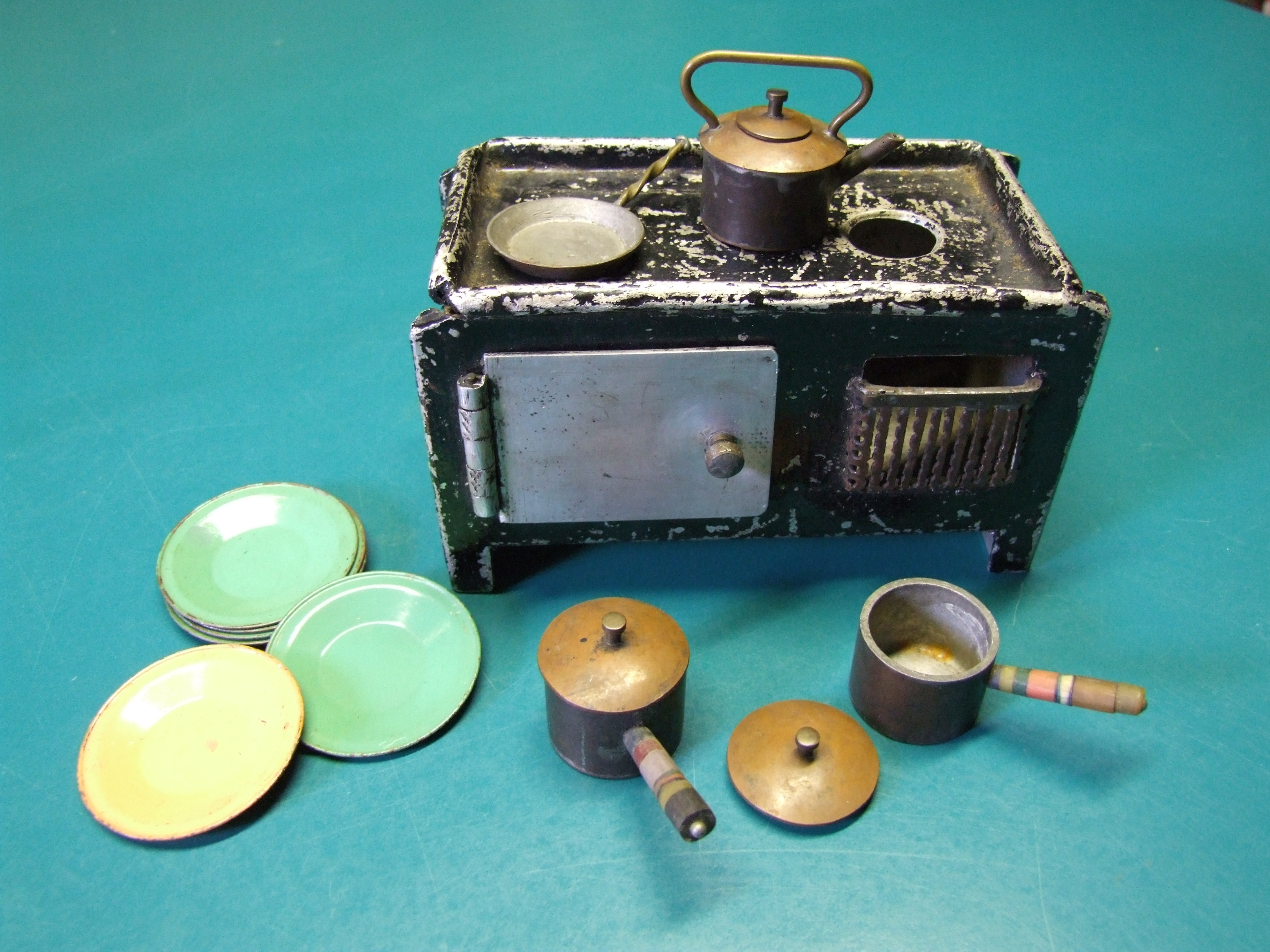 - DescriptionToy AGA oven, made by a workmate of the donor's father in Chatham Dockyard; aluminium, painted black; also 2 pans with lids, teapot, frying pan & 6 metal plates; used by Heather Taylor in circa 1945.