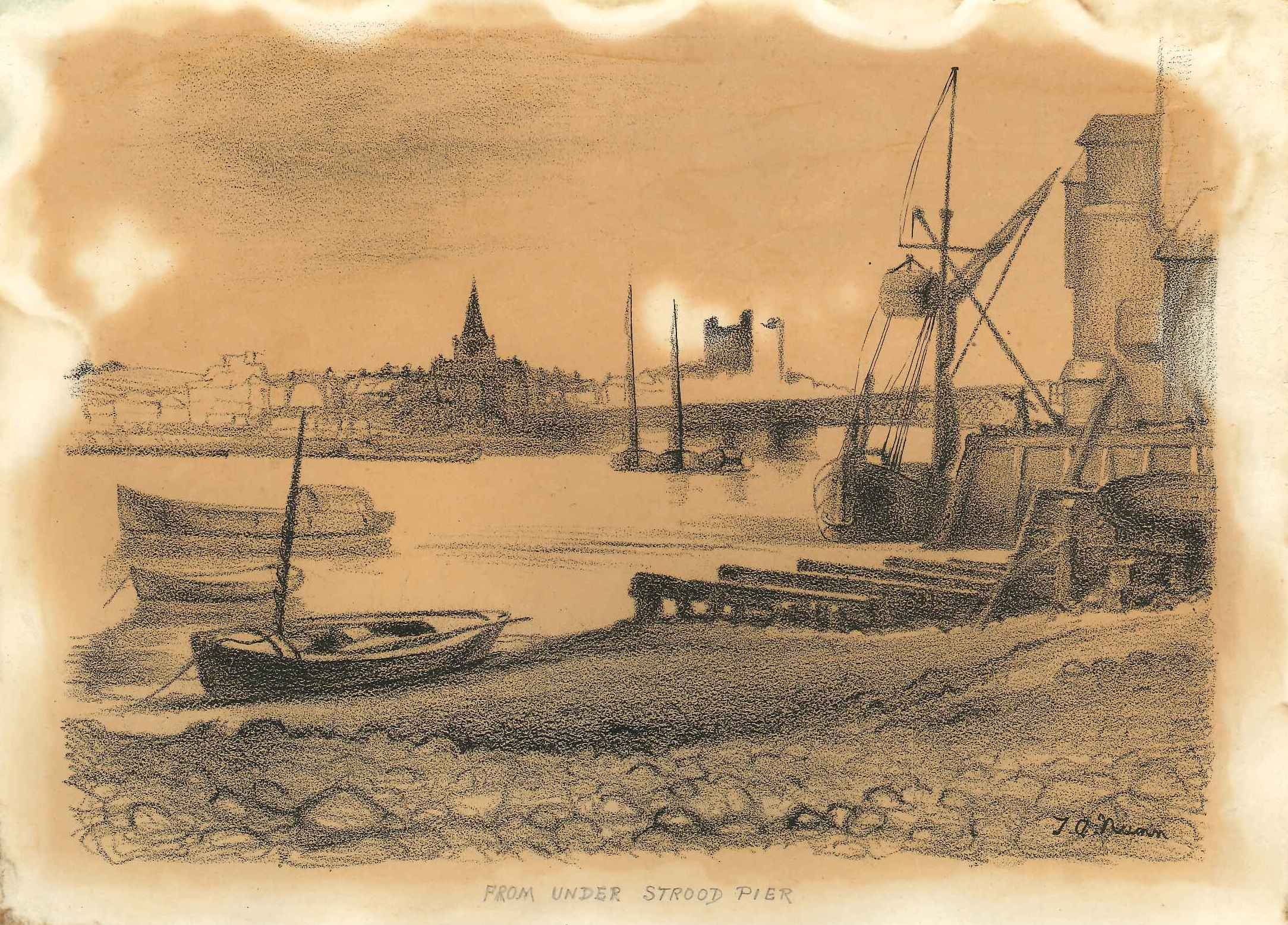 - DescriptionPrint of a (charcoal drawing) of Rochester castle and bridge from the Strood shore near the site of the old tide mill; various small vessels on the river, a barge being unloaded; mounted on card, the background has yellowed quite badly.