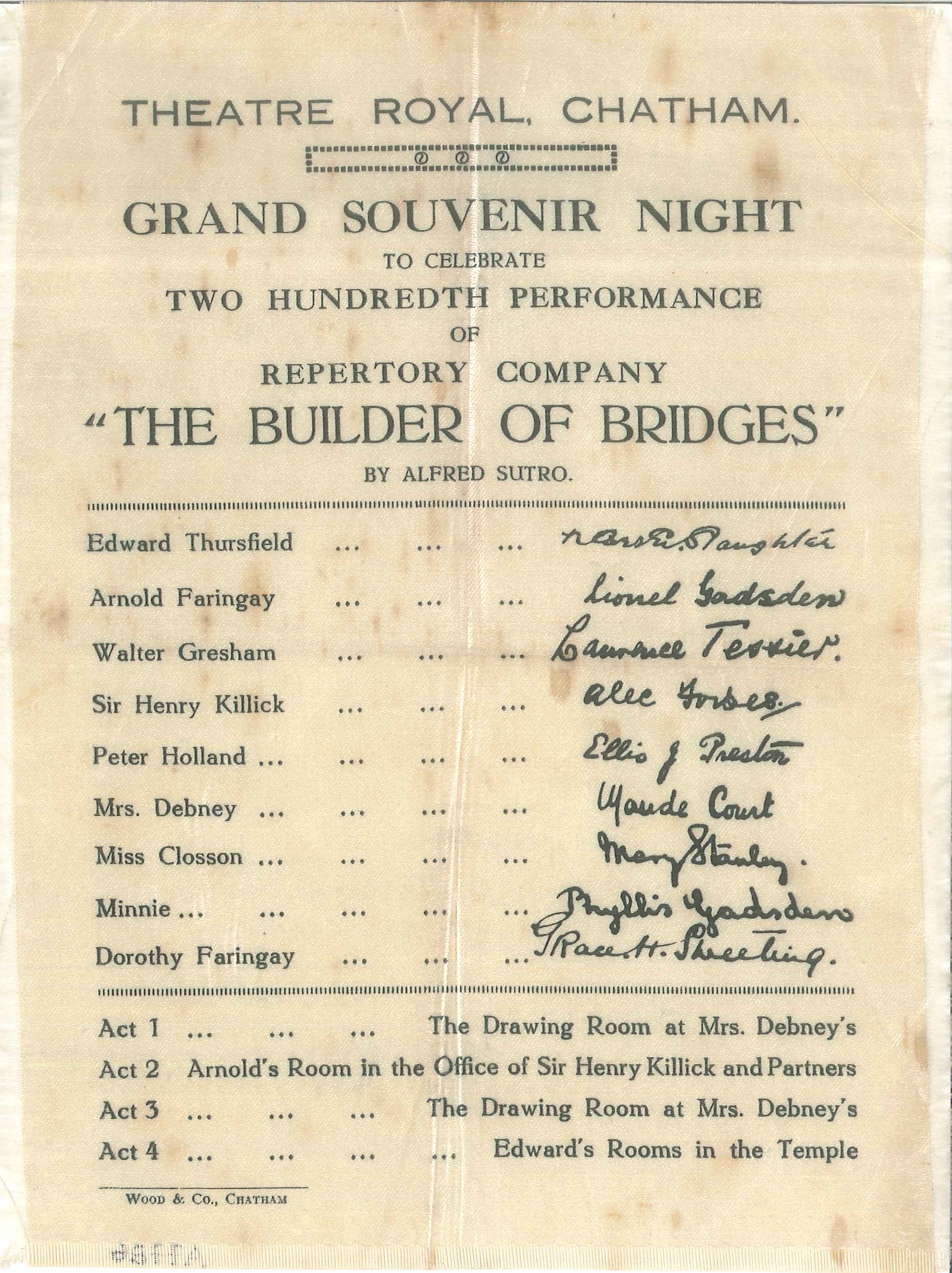 - DescriptionEphemera; souvenir silk programme; printed with details of play 'The Builder of Bridges' by Alfred Sutro at the Theatre Royal, Chatham; shows castlist with printed autographs.