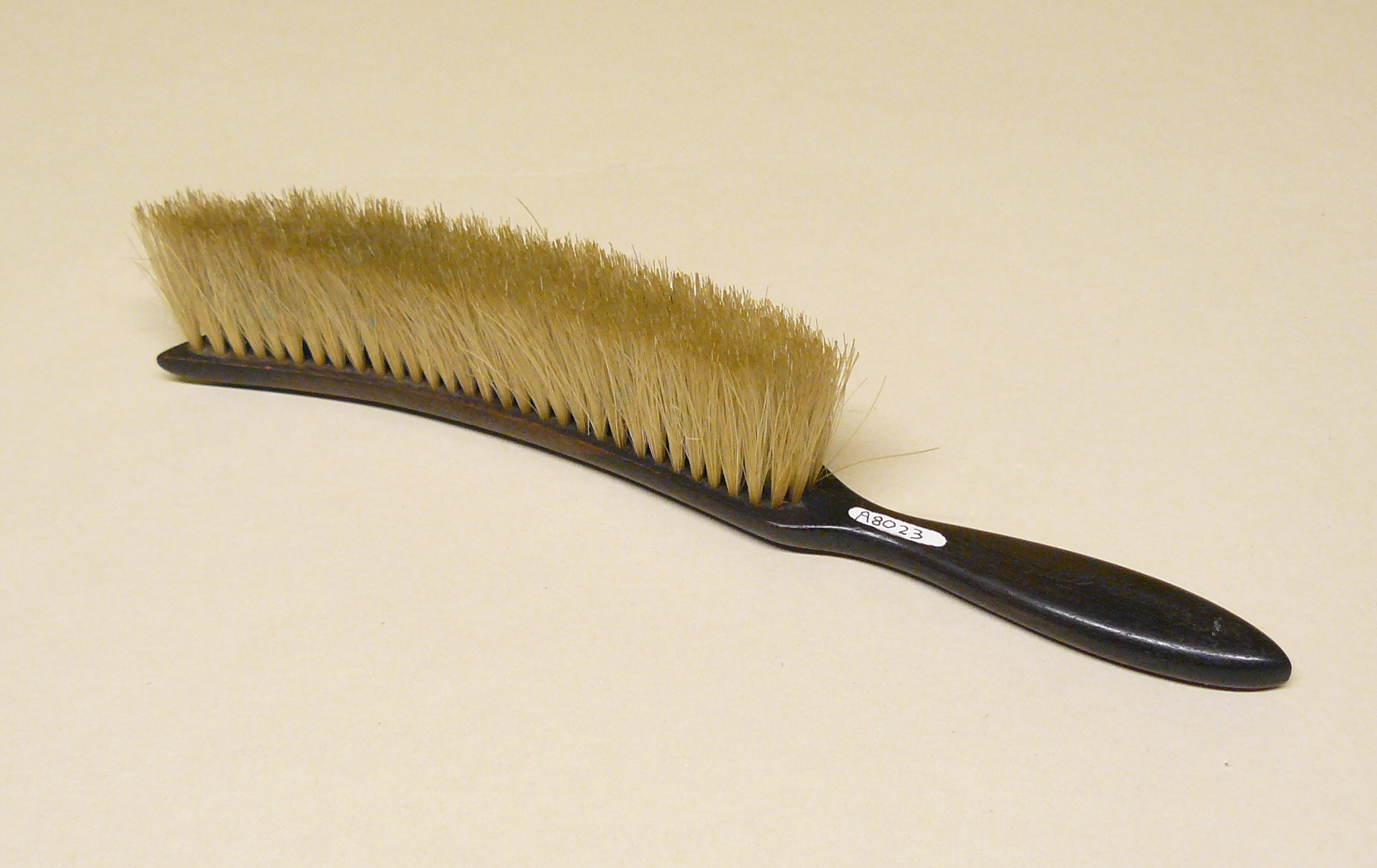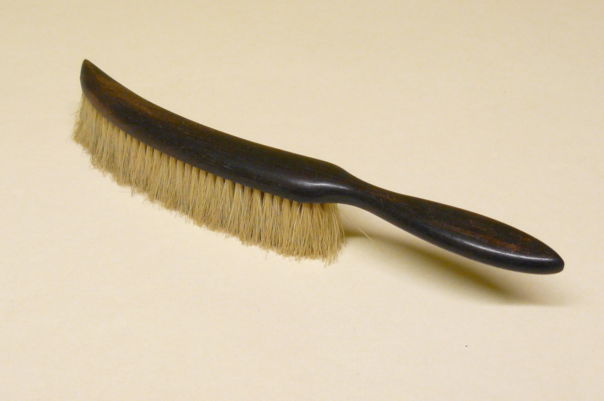 Hat brush; narrow curved head of bristles; grained wood, stamped 'Real Ebony' on handle. Horton collection.