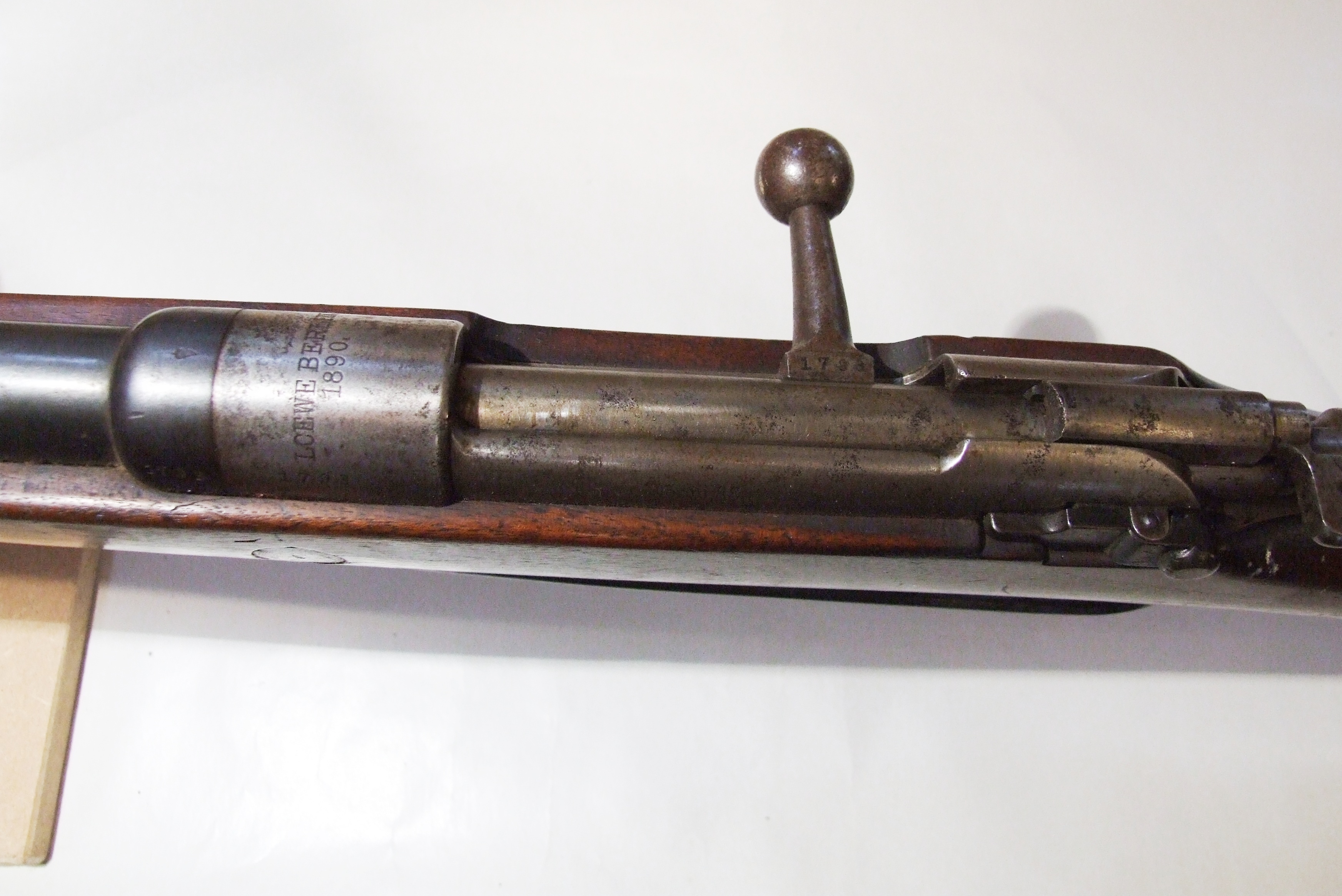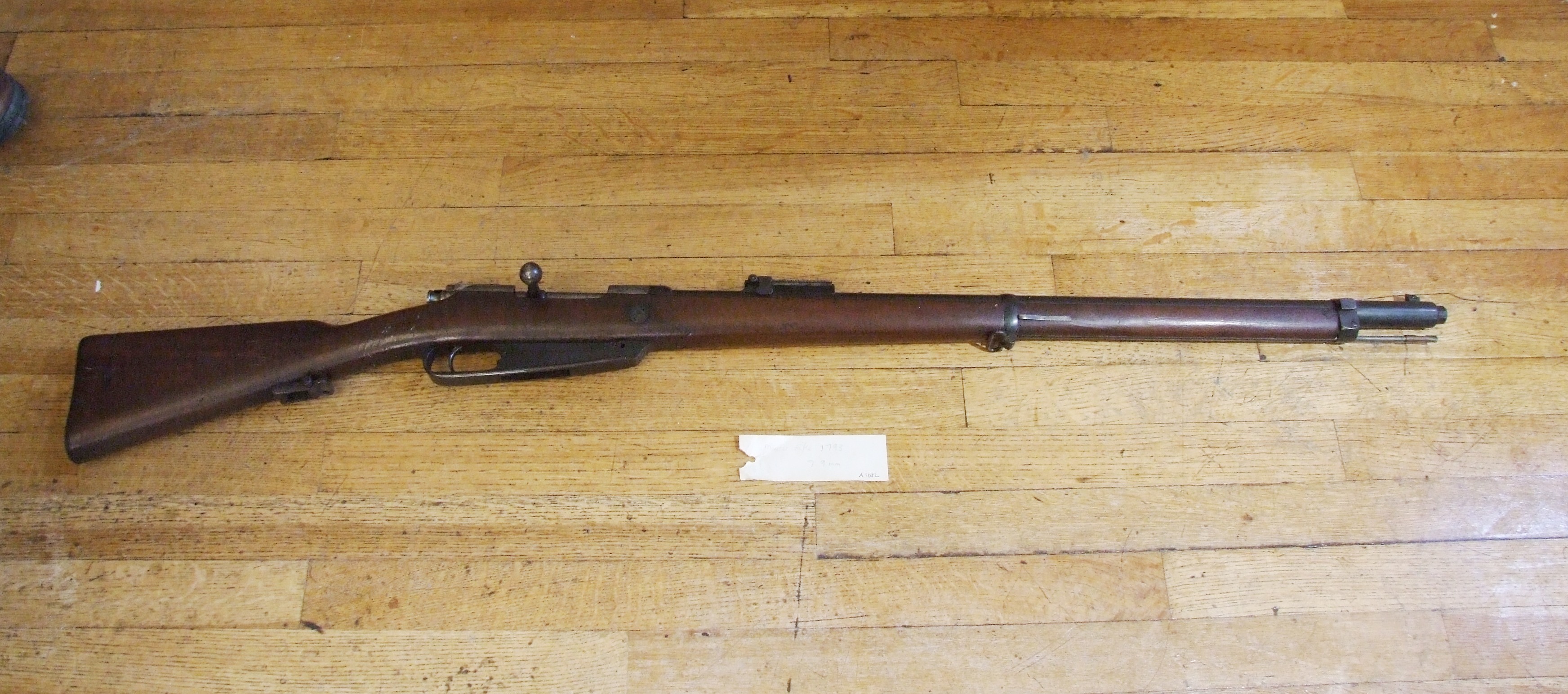 - DescriptionMauser Model 1888 Commision rifle (aka 'Gewehr 88'); 7.9mm; good condition, mechanism in full working order; woodwork slightly dented; folding adjustable sights; this was the first clip-fed military rifle; Mauser made the bolt, Mannlicher made the magazine.