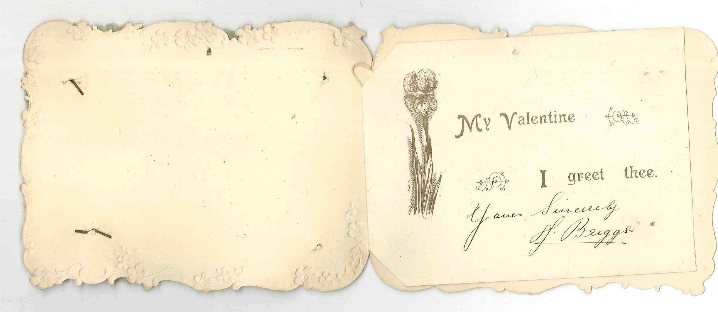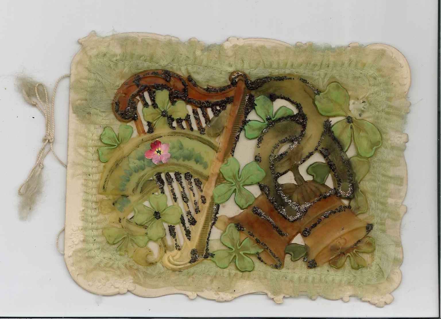 - DescriptionValentine's card; painted openwork relief design (in moulded cellulose?) of a harp, bells & flowers; backed with pleated green textile, stuck on to a card with embossed flowers; inside is a printed message; Horton collection.