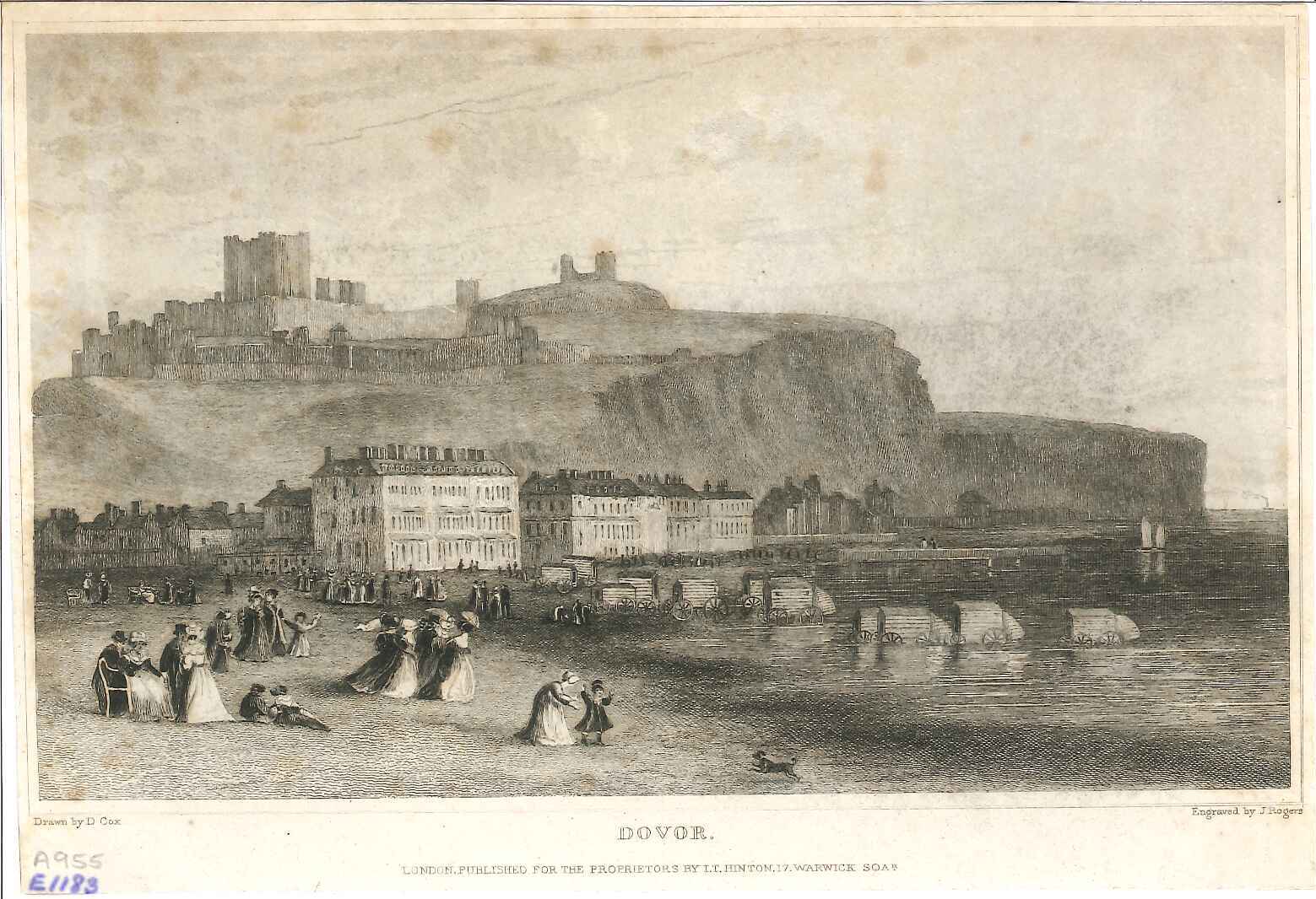 Engraving of Dover Castle, with people at sea edge and bathing carriages in shallows.