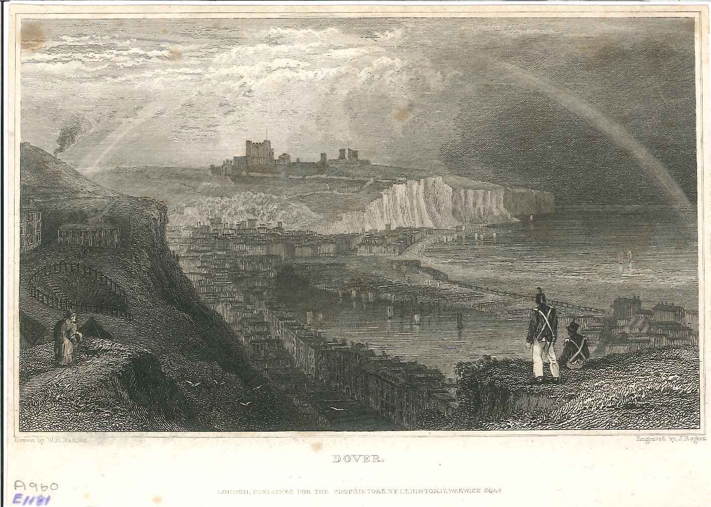 - DescriptionEngraving of a view of Dover with 2 soldiers looking down at harbour, Castle in background, rainbow in the sky