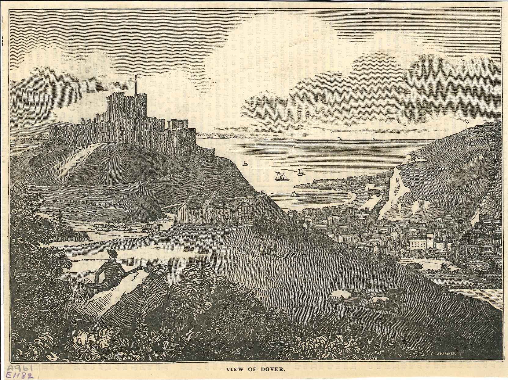 Engraving of View of Dover Castle and town; taken from a journal, text on the reverse.