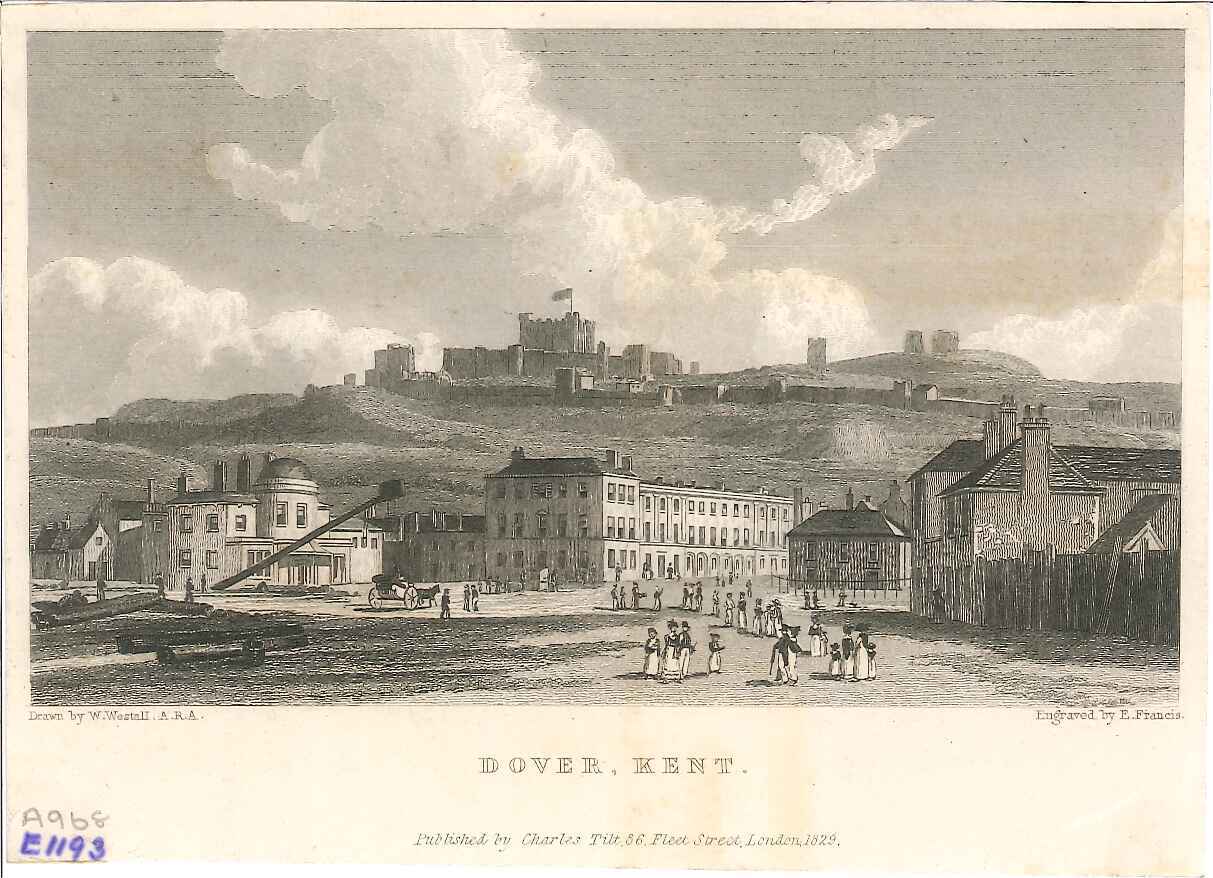 - DescriptionEngraving of view Dover with castle in background and grand buildings and houses in foreground with people around