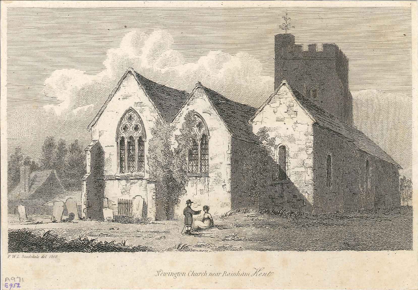 engraving of Newington Church (near Rainham) with couple sat in graveyard