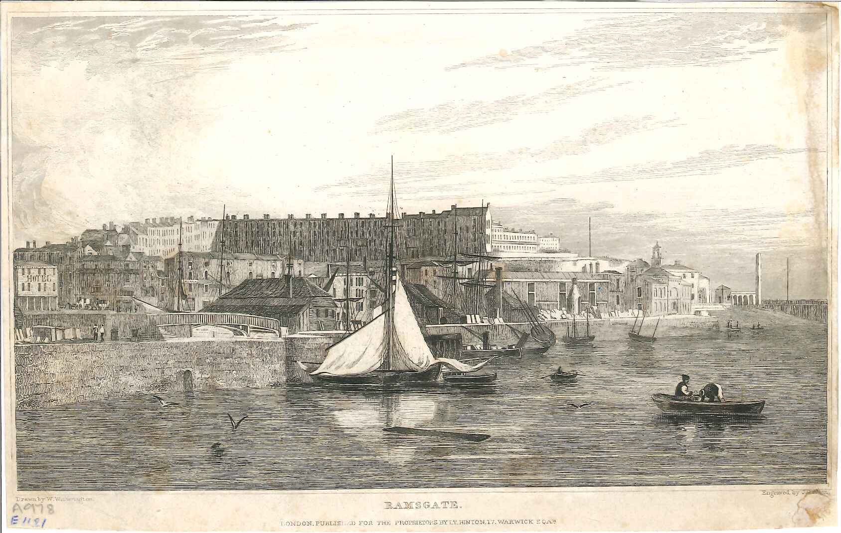 Engraving of the harbour of Ramsgate featuring fishing boats, and in the background houses and a hotel