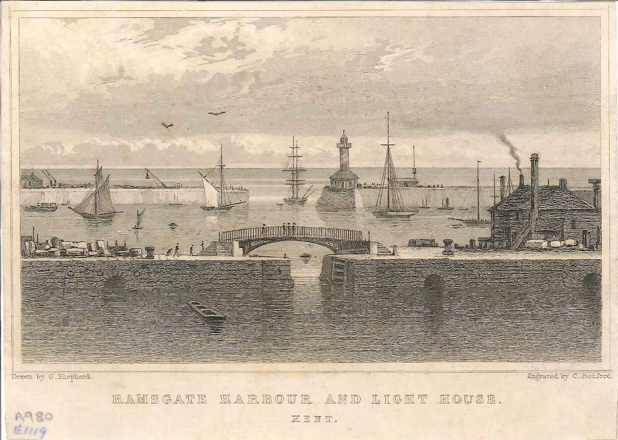engraving of the harbour of Ramsgate and lighthouse with ships going to sea, taken from inland