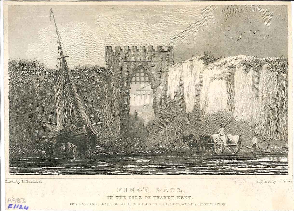 - DescriptionPrint of a view of King's Gate, Thanet; shows coastal gatehouse with portcullis, building with columns behind; beached boat being unloaded and horse & cart in the foreground. Originally produced for the "England's Topographer" series of Kent views (London 1828-1831).