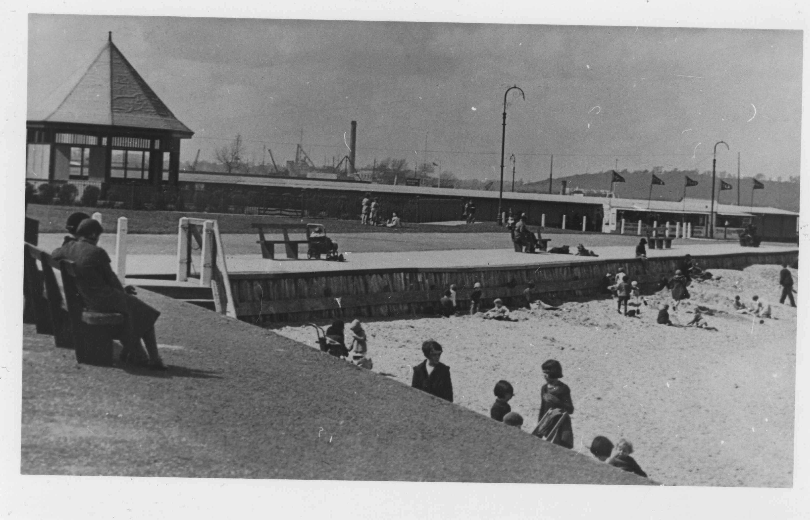 - DescriptionModern monochrome photographic copy of a postcard photograph of holidaymakers on the 'beach' at Gillingham Strand; children play on the foreshore; some adults are seated on benches.