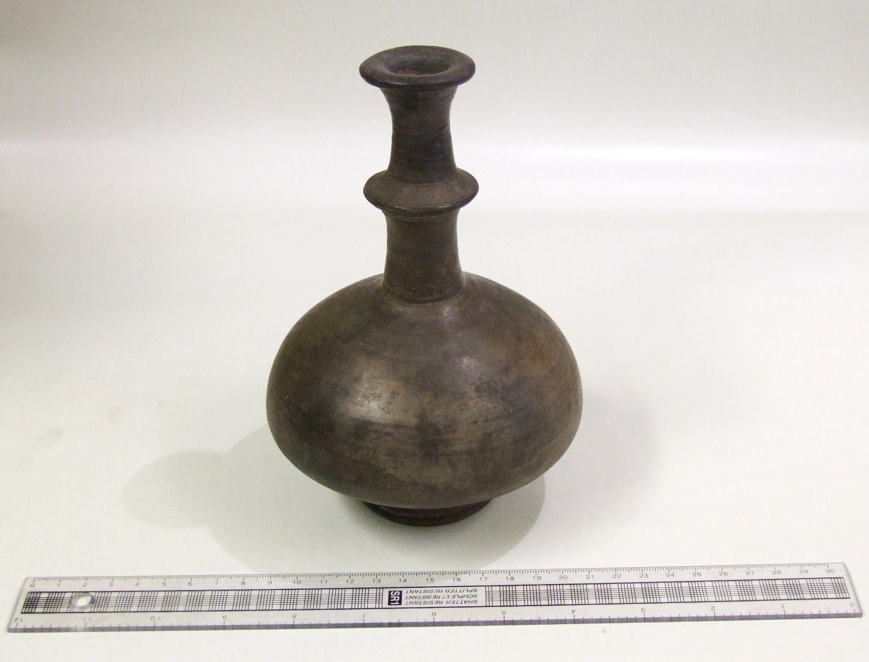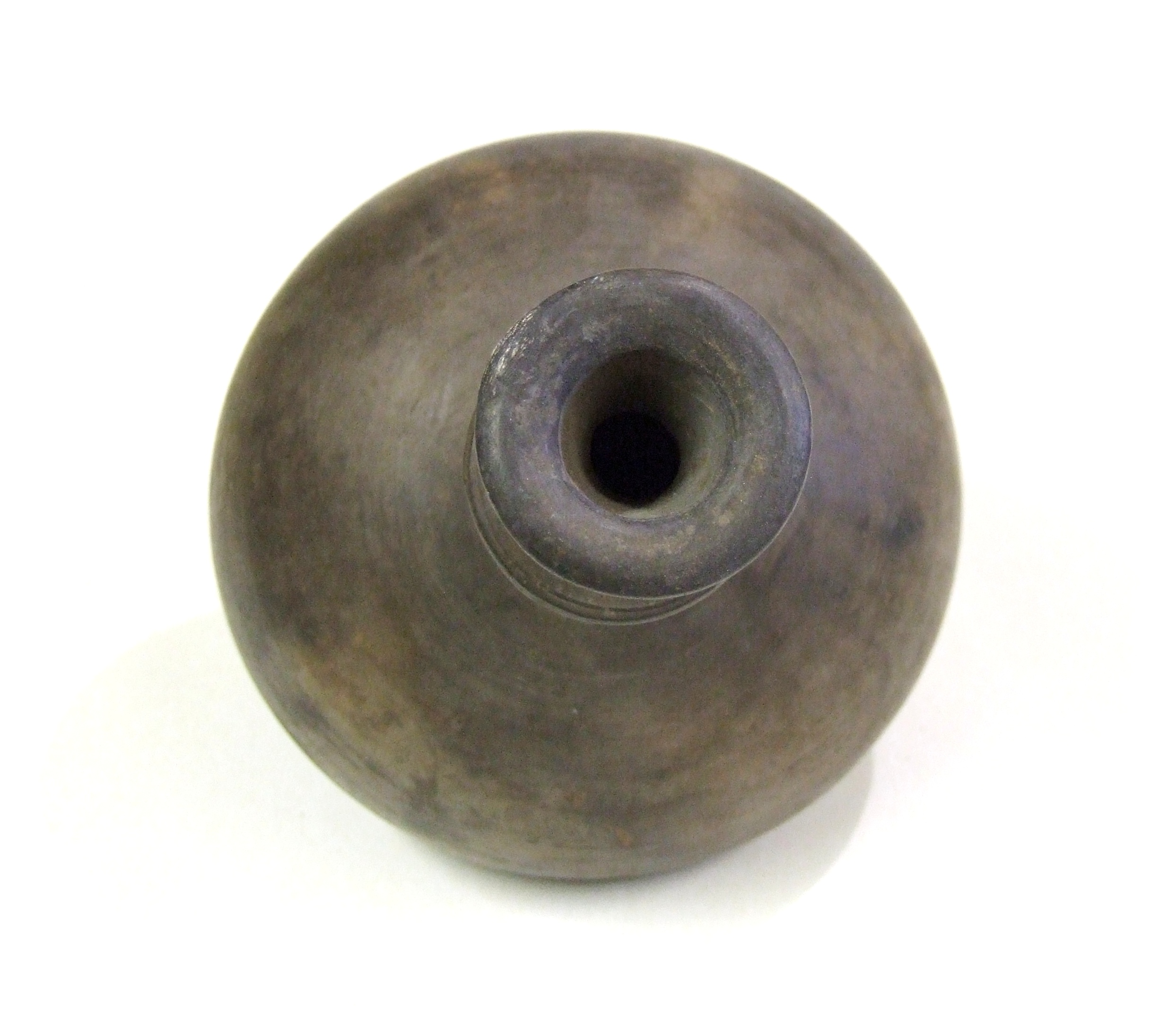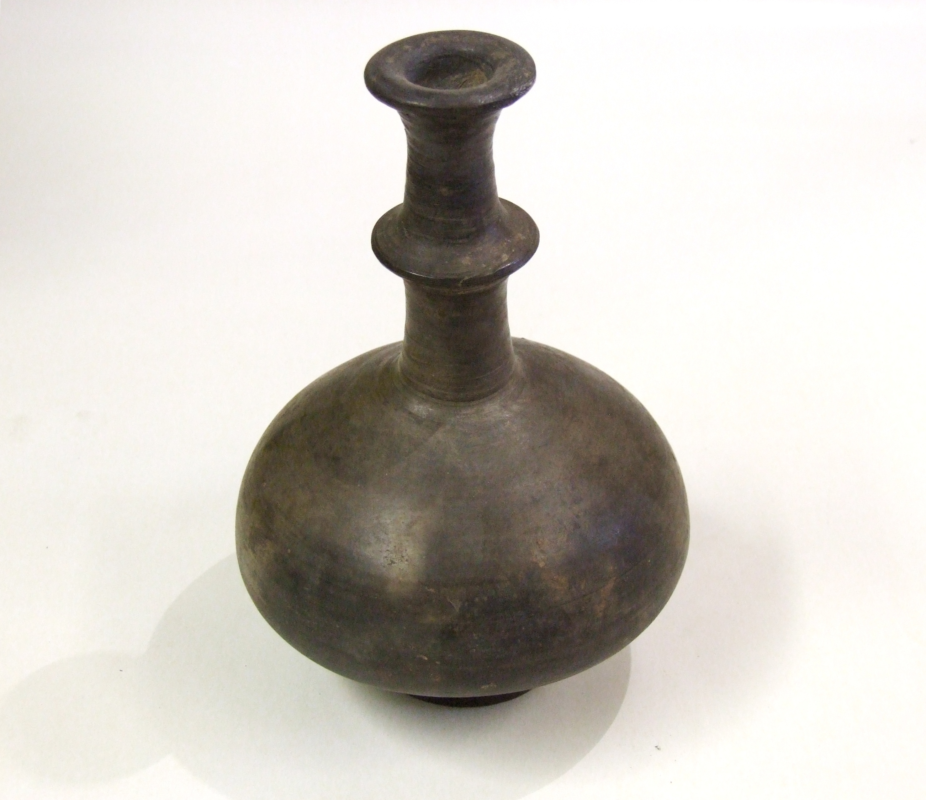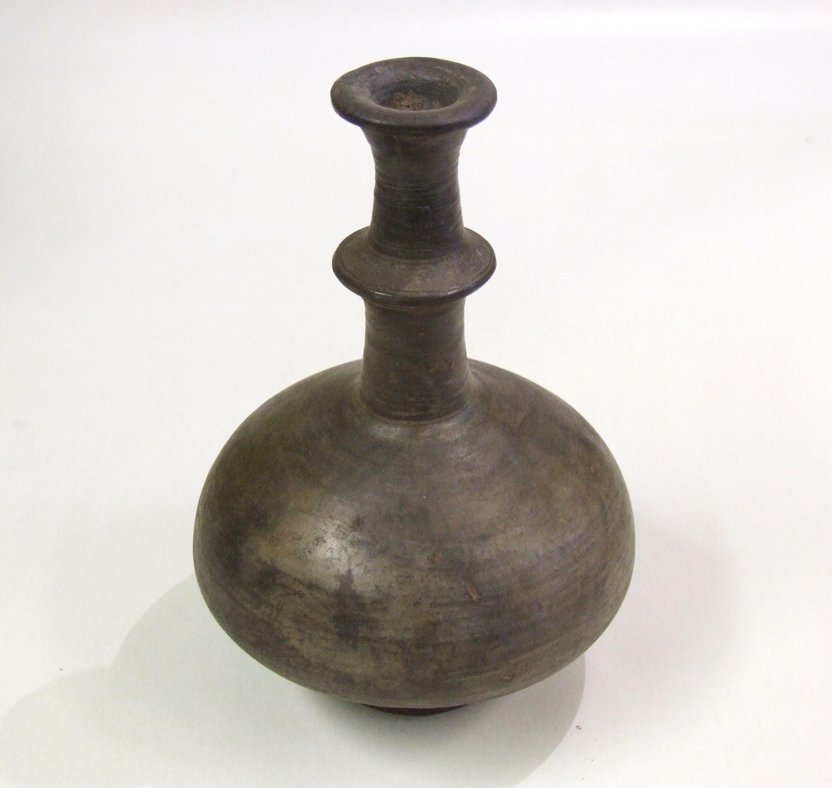 - DescriptionBlack burnished bottle or vase?; globular body, long neck with 'flange' midway, flared rim; wheel-thrown, grey fabric, lightly burnished; obviously not ordinary kitchenware - for oil or scent?