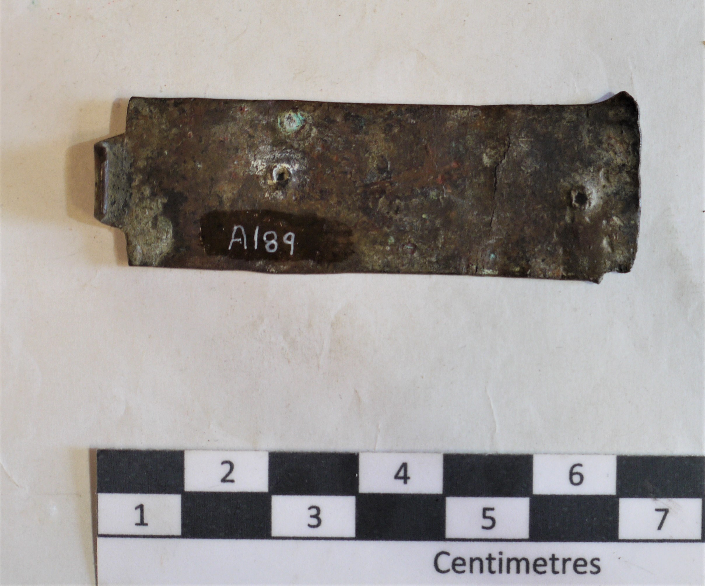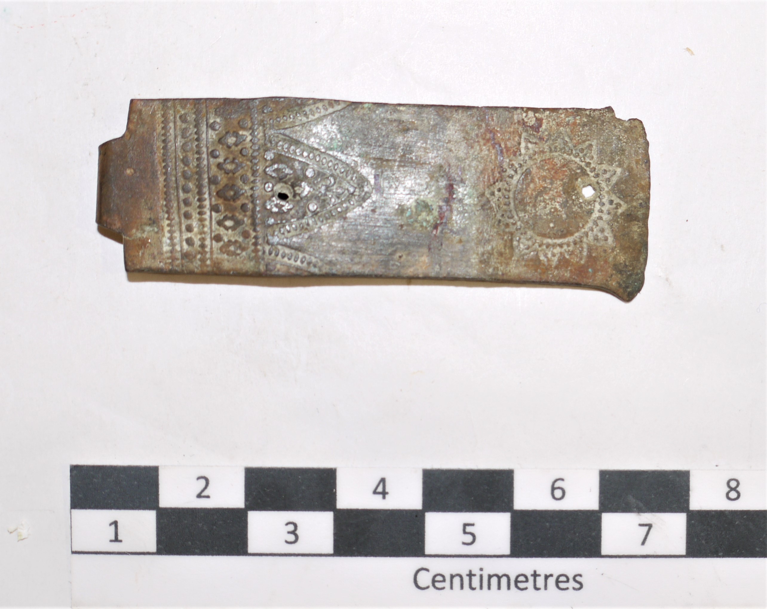 Small rectangular book clasp, engraved with a radiate sun and stamped with a decorative border including fleur-de-lys.