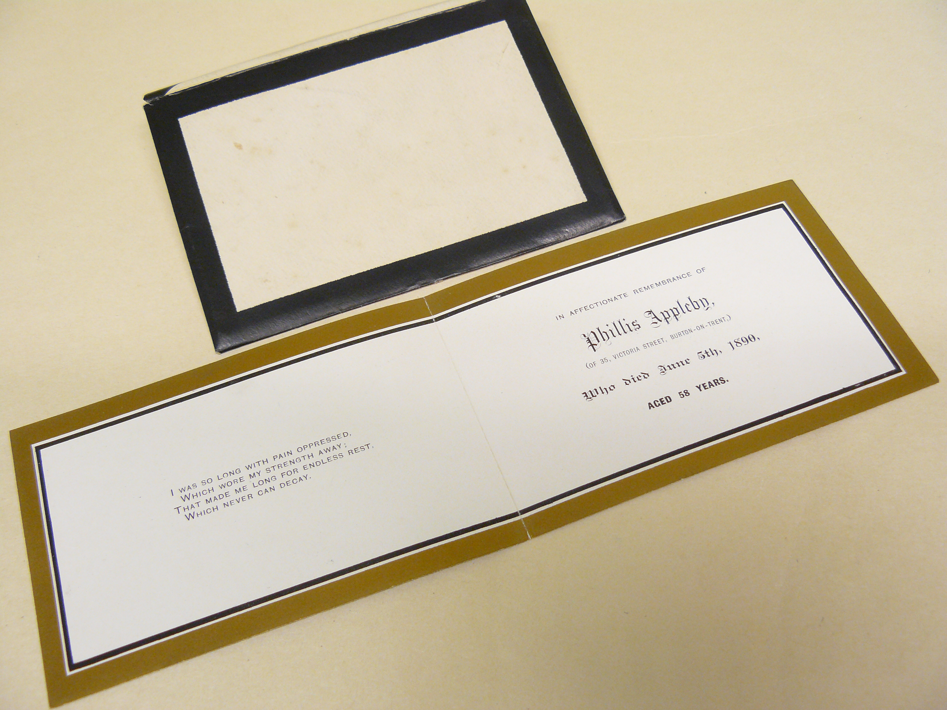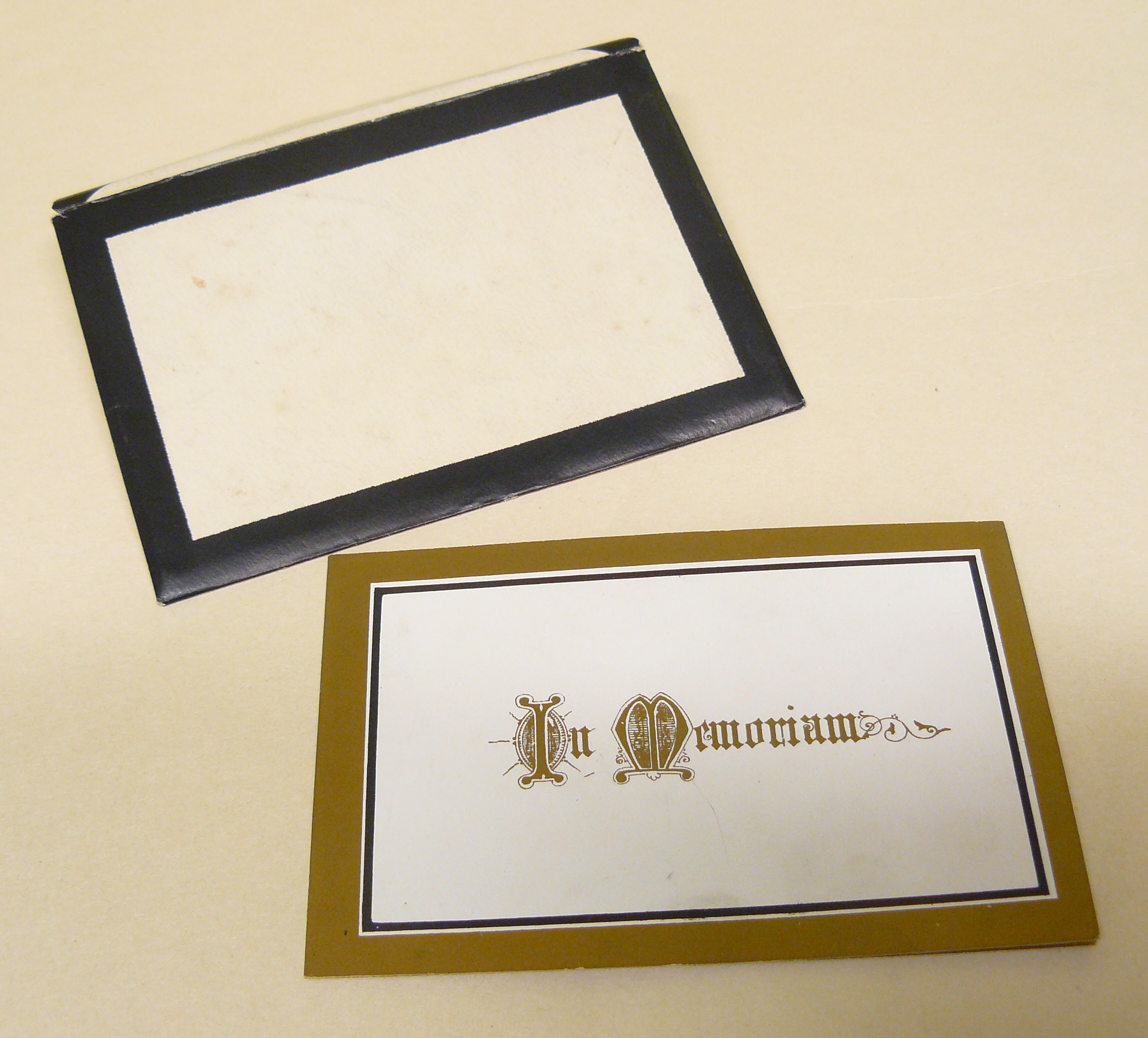 - DescriptionFuneral card; 'In Memory of' card for Phillis Appleby; white card with gold lettering and black and gold border; in black-edged envelope; see also A7156. Horton collection.