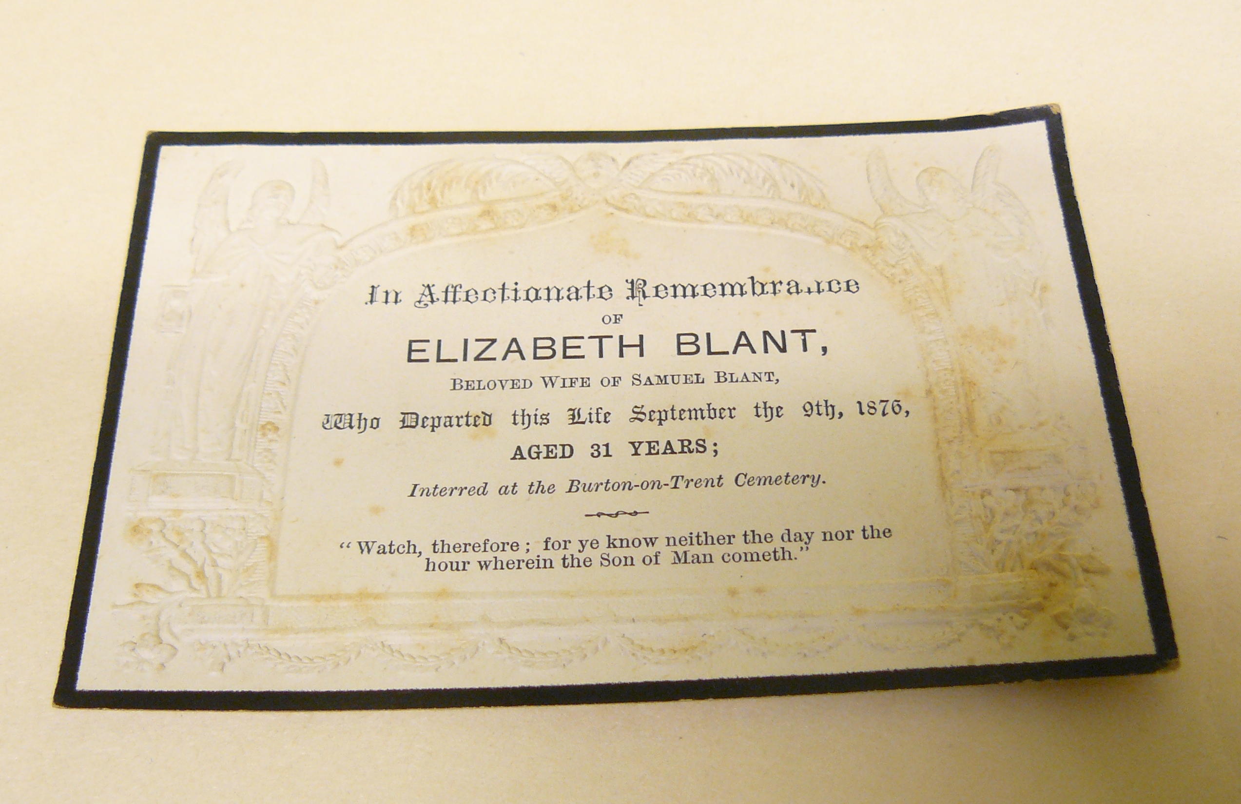 - DescriptionFuneral card; 'In Affectionate Remembrance' card for Elizabeth Blant who died September 9th 1876; embossed card with design of a white tomb, mourning angels; black edged. Horton collection.