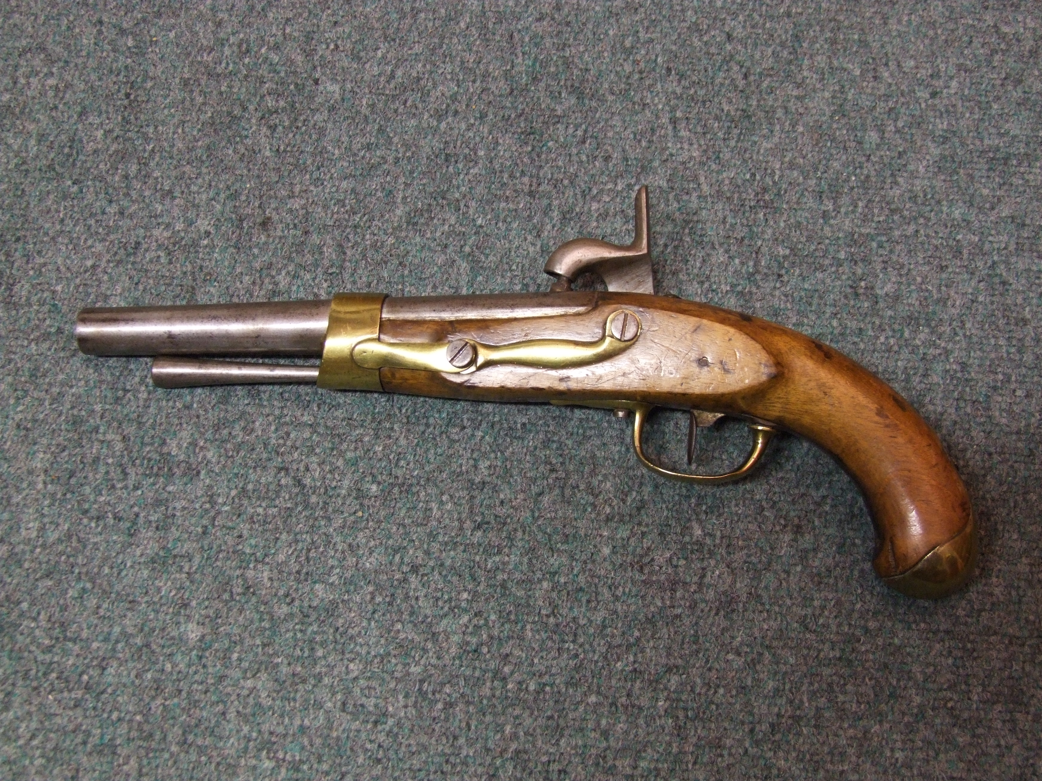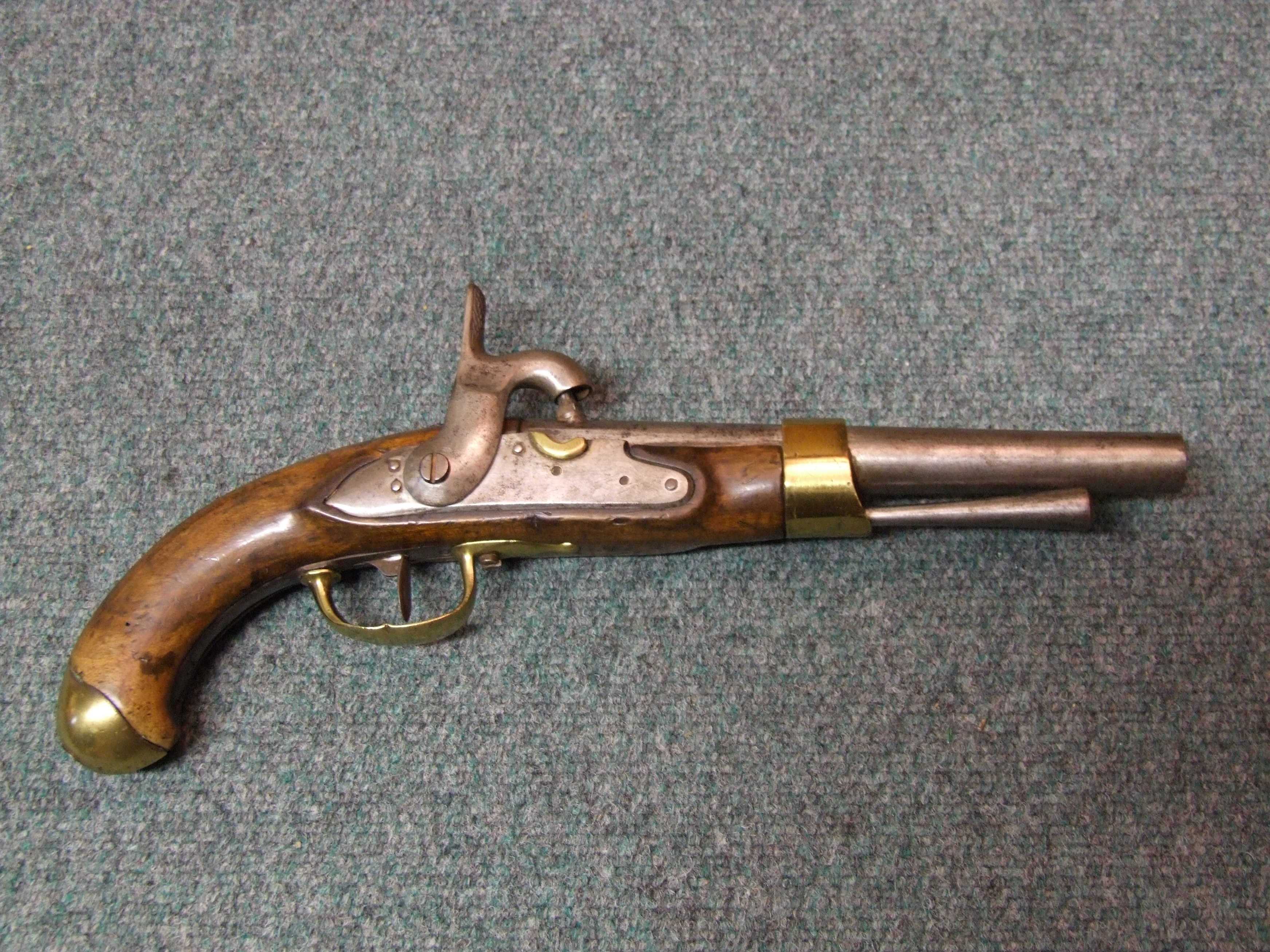 - DescriptionPercussion cap pistol; 1822 pattern French pistol; converted smoothbore flintlock pistol, brass fittings, with steel barrel, lock & ramrod; trigger guard has internal stamp ('AH'?), some marks have been erased; probably converted to percussion circa 1835.