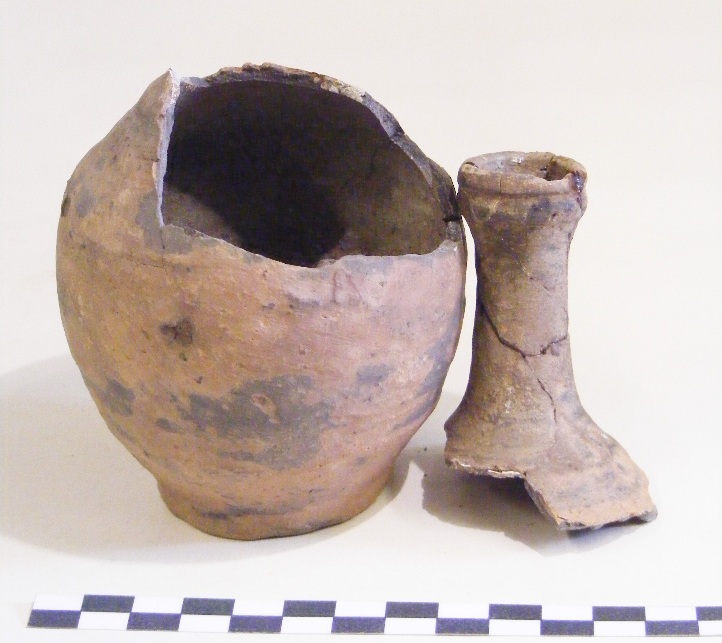 - DescriptionGrey ware bottle in fragments; wheel-thrown; globular body; thin-walled dark grey fabric; long neck (very narrow inside) with thickened rim.