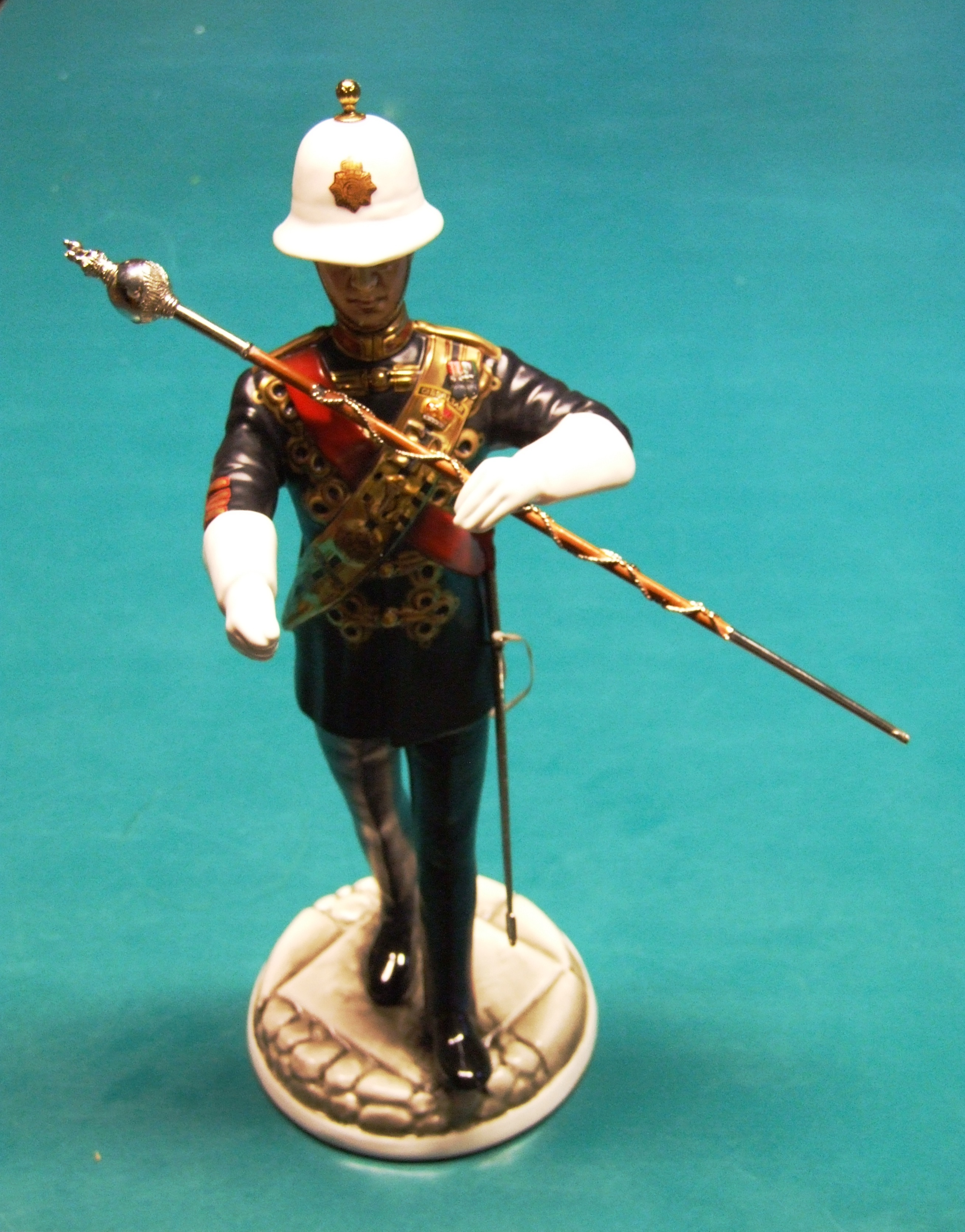 - DescriptionMichael Sutty limited edition (no.22 of 250) porcelain figure of a Royal Marines drum major, hand painted; metal fittings, separate baton. Presented to the Borough of Medway by the Royal Marines on the occasion of the conferment of the Freedom of the Borough 01/05/1979. The uniform is the No.1 ceremonial dress as worn by a Royal Marines Drum Major.