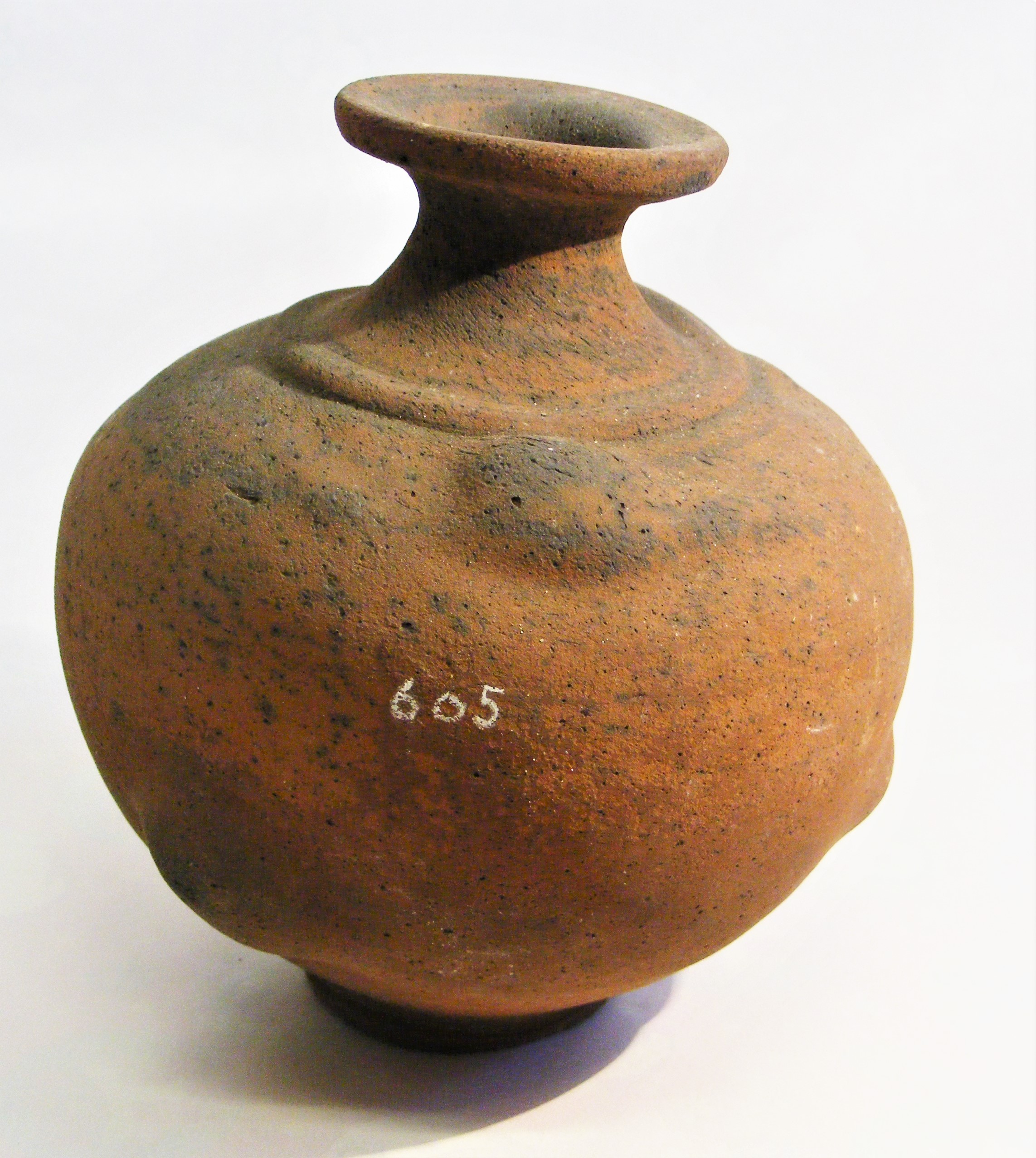 - DescriptionRed ware bottle or jar; bulbous body, full of manufacturing weaknesses, air bubbles; orange fabric, gone greyish & brittle internally; pedestal base; short neck with flared rim.