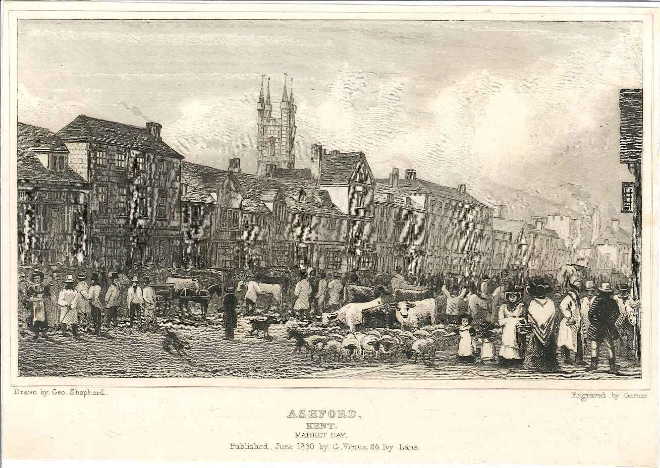 - DescriptionPrint of a view of Ashford town centre; shows a busy market day scene, with crowds of people, sheep & cattle. Originally produced for the "England's Topographer" series of Kent views (London 1828-1831). Part of the donation by W H Harrison, but not previously numbered.