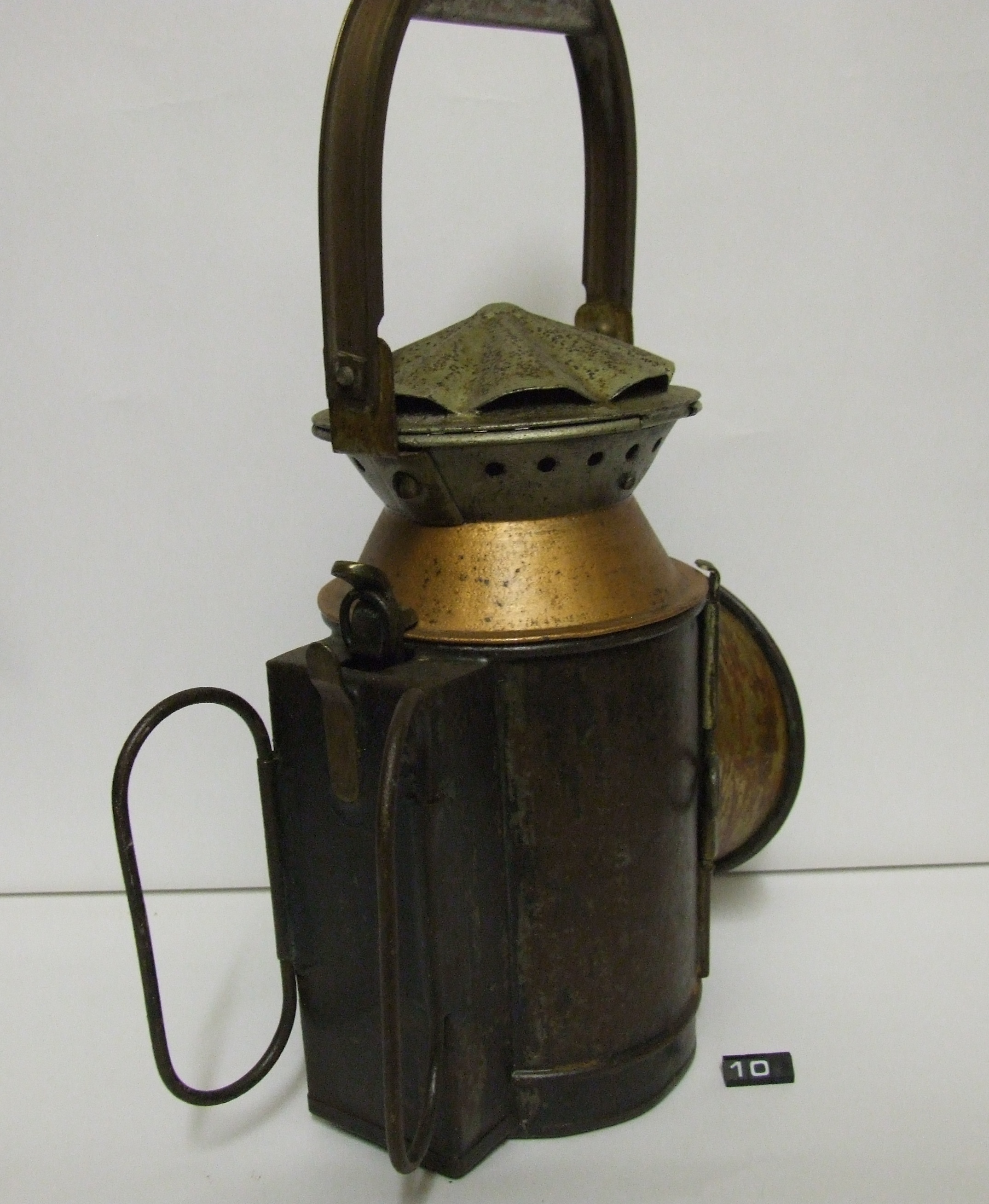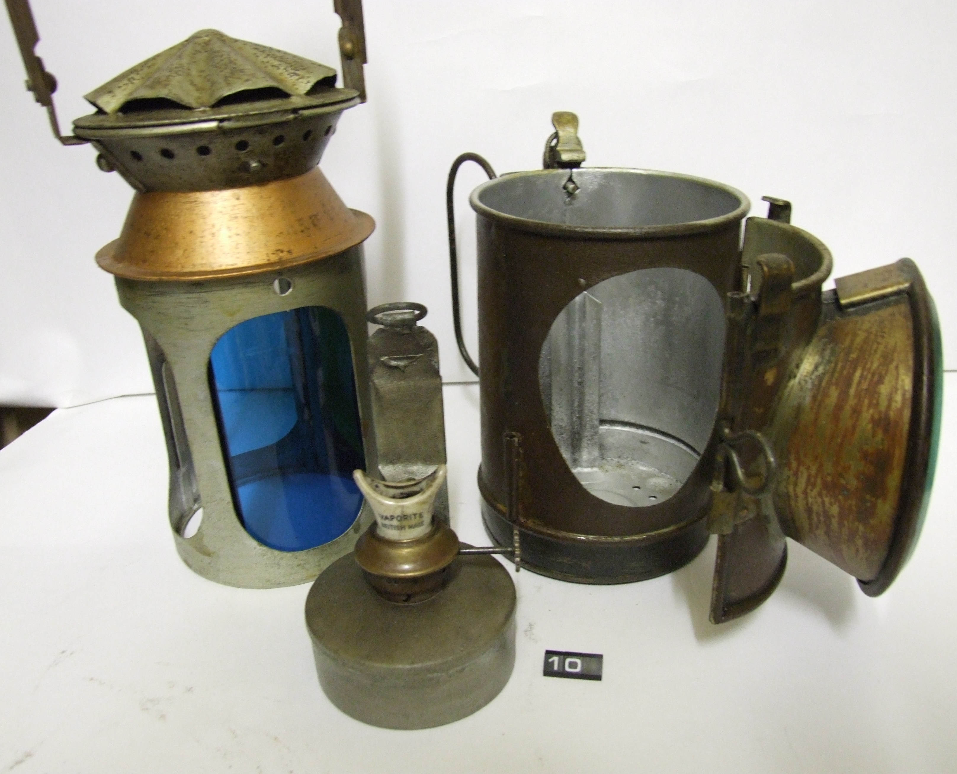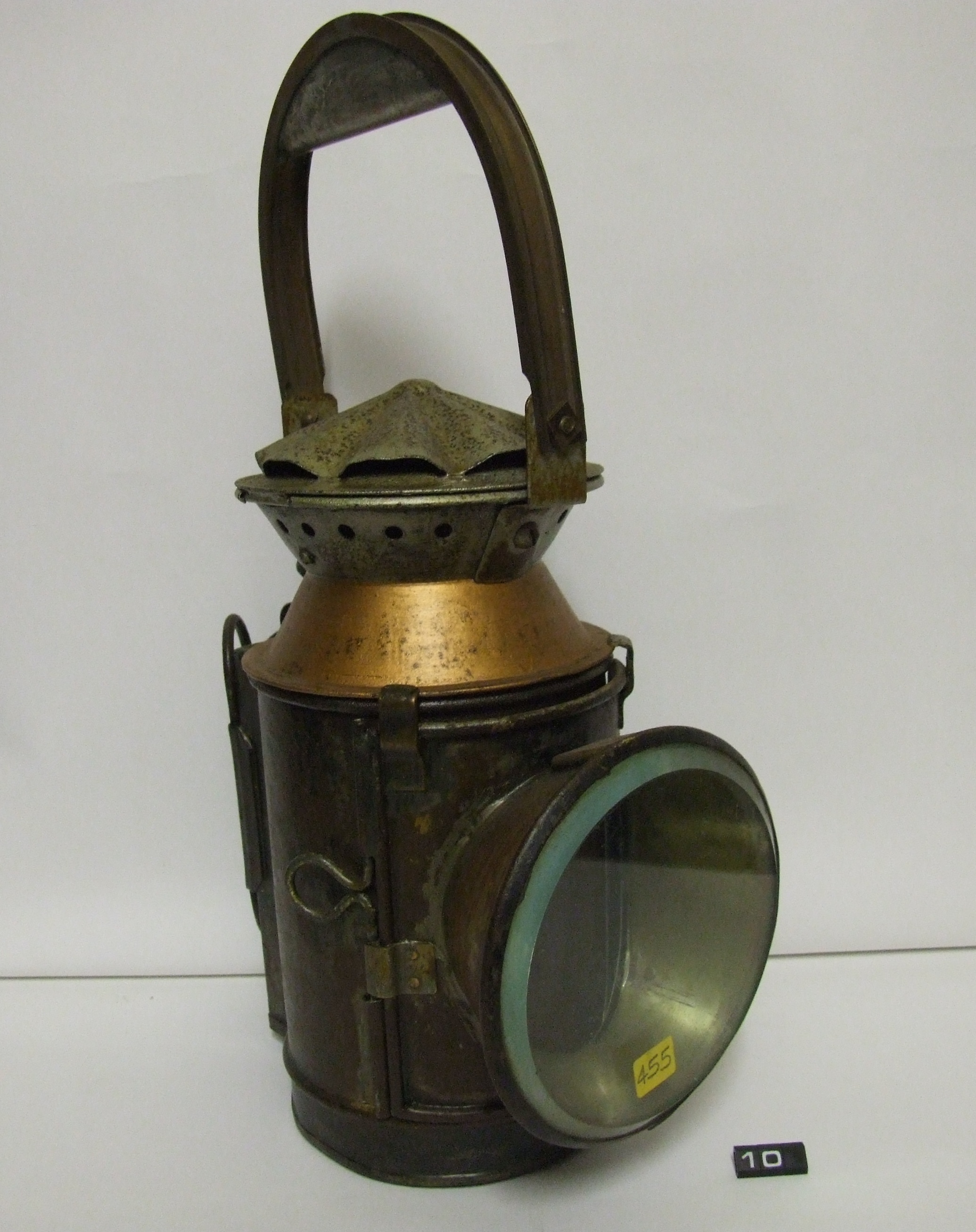 Oil lamp for railway signalling; tinned steel body, chimney, filter holder & fount; polished brass(?) reflector; ceramic & brass burner; thick glass lens, with amber and blue filters, one filter and the reflector are missing; (the blue filter was used because the yellow light of the oil lamp would show through the blue filter, resulting in a green light being shown); markings show the lamp was used by Southern Railways; Norris collection.