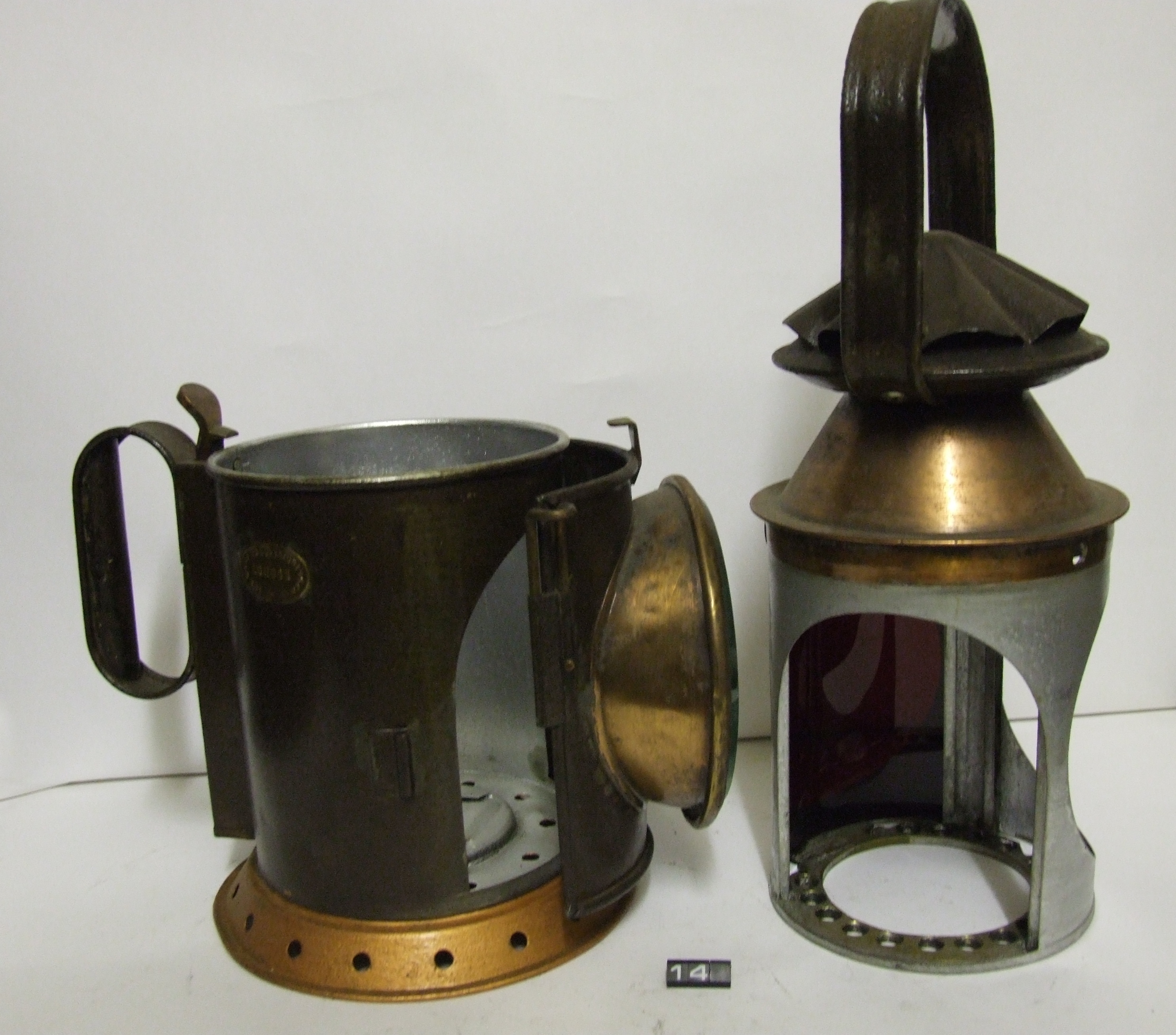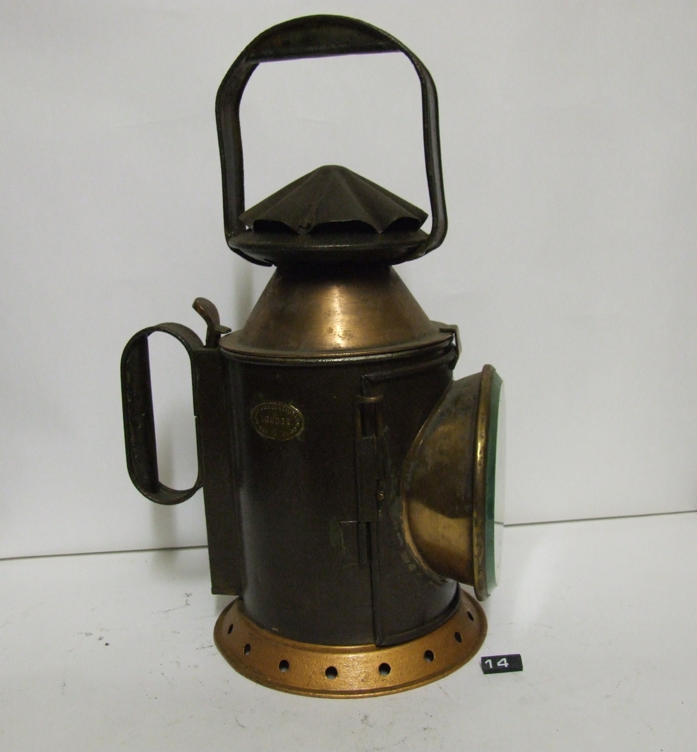 - DescriptionOil lamp for railway signalling; tinned steel body with brass & copper lens carrier; burner, reflector & fount missing; thick glass lens, with red filter (the other filter is missing); top carrying handle has been repaired using modern x-head screws Norris collection.
