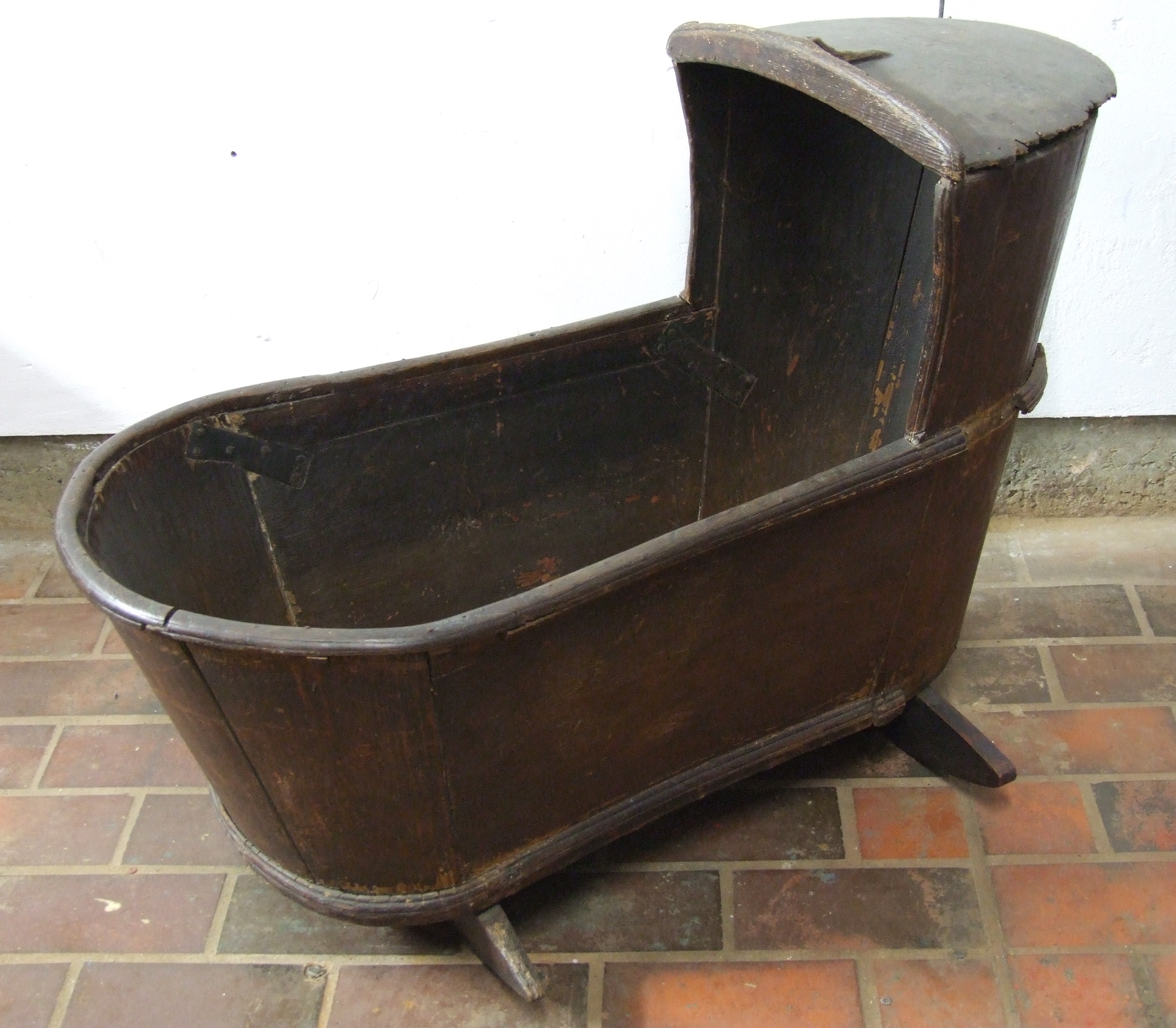 Rocking cradle made from wood from a Napoleonic period warship; the top has detached; slightly battered, but sound; some moulded trim is missing.