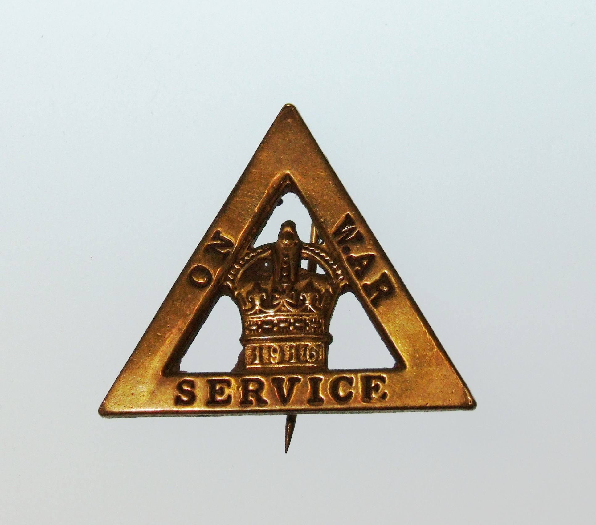 - DescriptionWar Service badge; triangular badge worn by civilians during World War One doing essential war work; this prevented them being criticised (or presented with a white feather) by others; often worn (but not exclusively) by women in the munitions industry and by land girls.