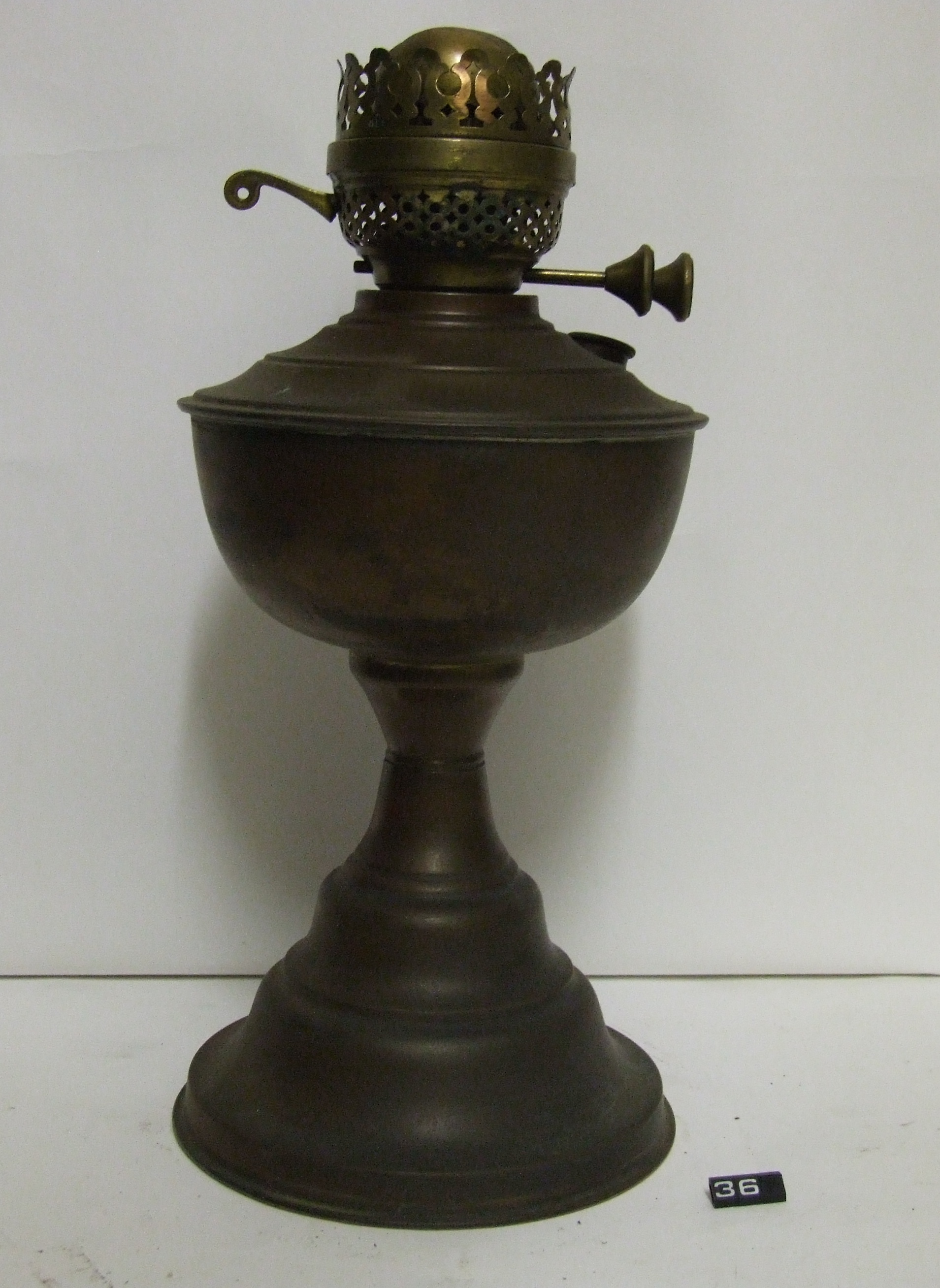- DescriptionOil lamp, freestanding domestic table lamp; plated brass lamp with anodised copper finish, weighted base; duplex burner by Falk, with 'snuffing' mechanism; plating is worn in places; Norris collection.