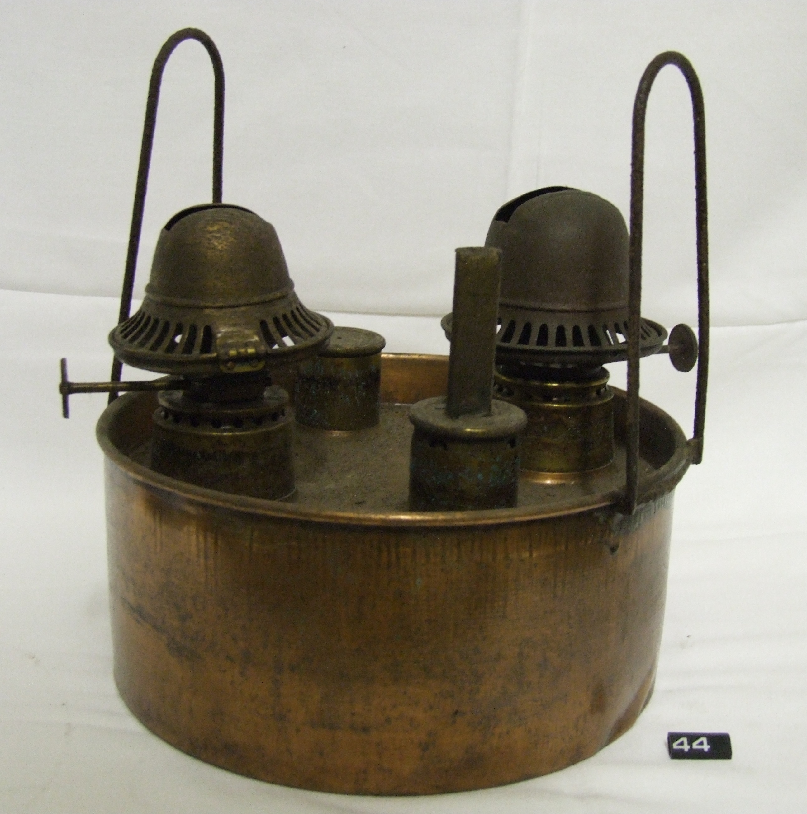 - DescriptionOil lamp heater; copper reservoir with push fit filler cap; two brass burner assemblies, one is 1", the other ¾"; two steel carrying handles; float type fuel level indicator; some light corrosion & denting; also known as a brooder lamp, used in greenhouses and chicken farms; Norris collection.
