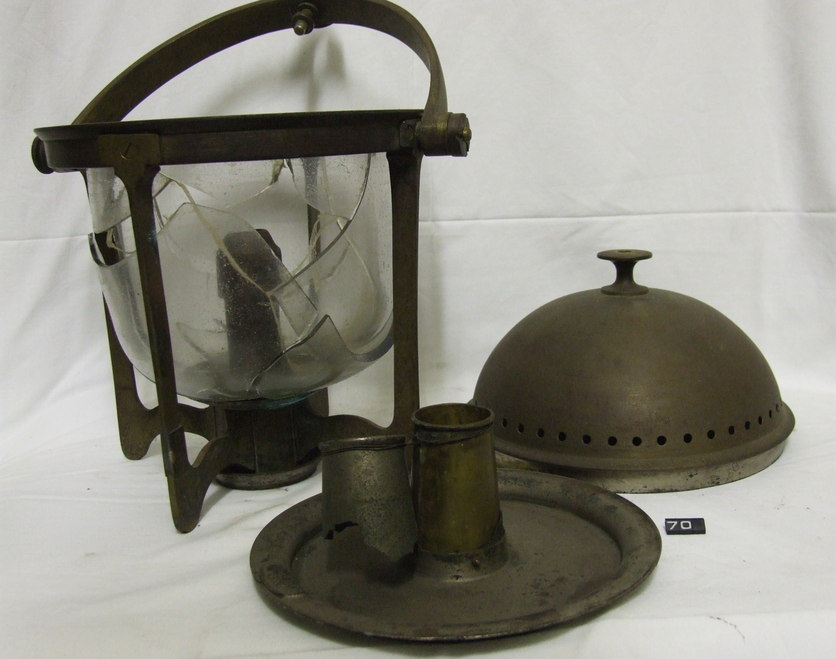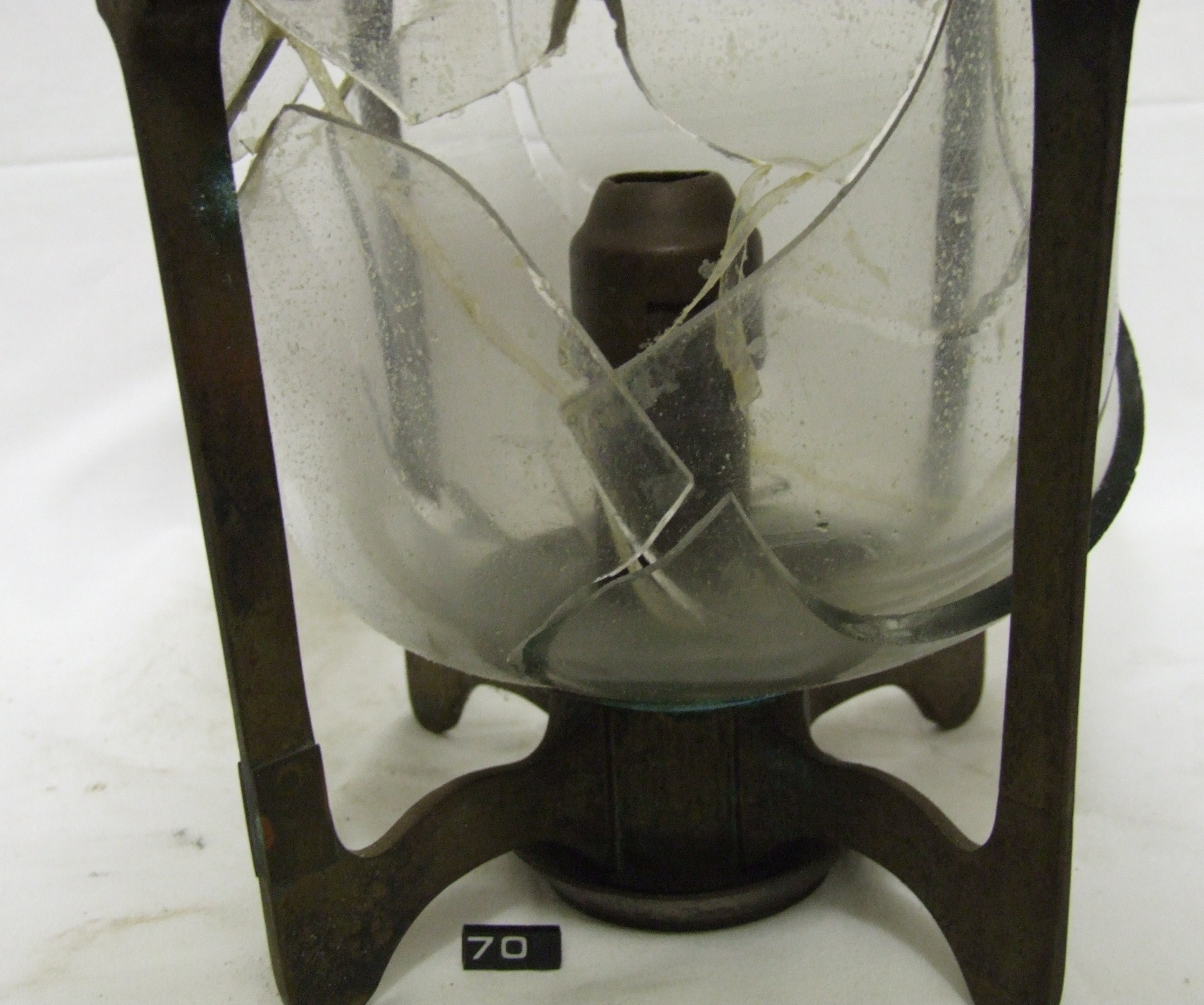 - DescriptionLarge marine candle lantern or lamp; storm/hurricane lantern; domed top cover, spring-loaded candle holder; the glass globe has been smashed, most pieces present; Norris collection.