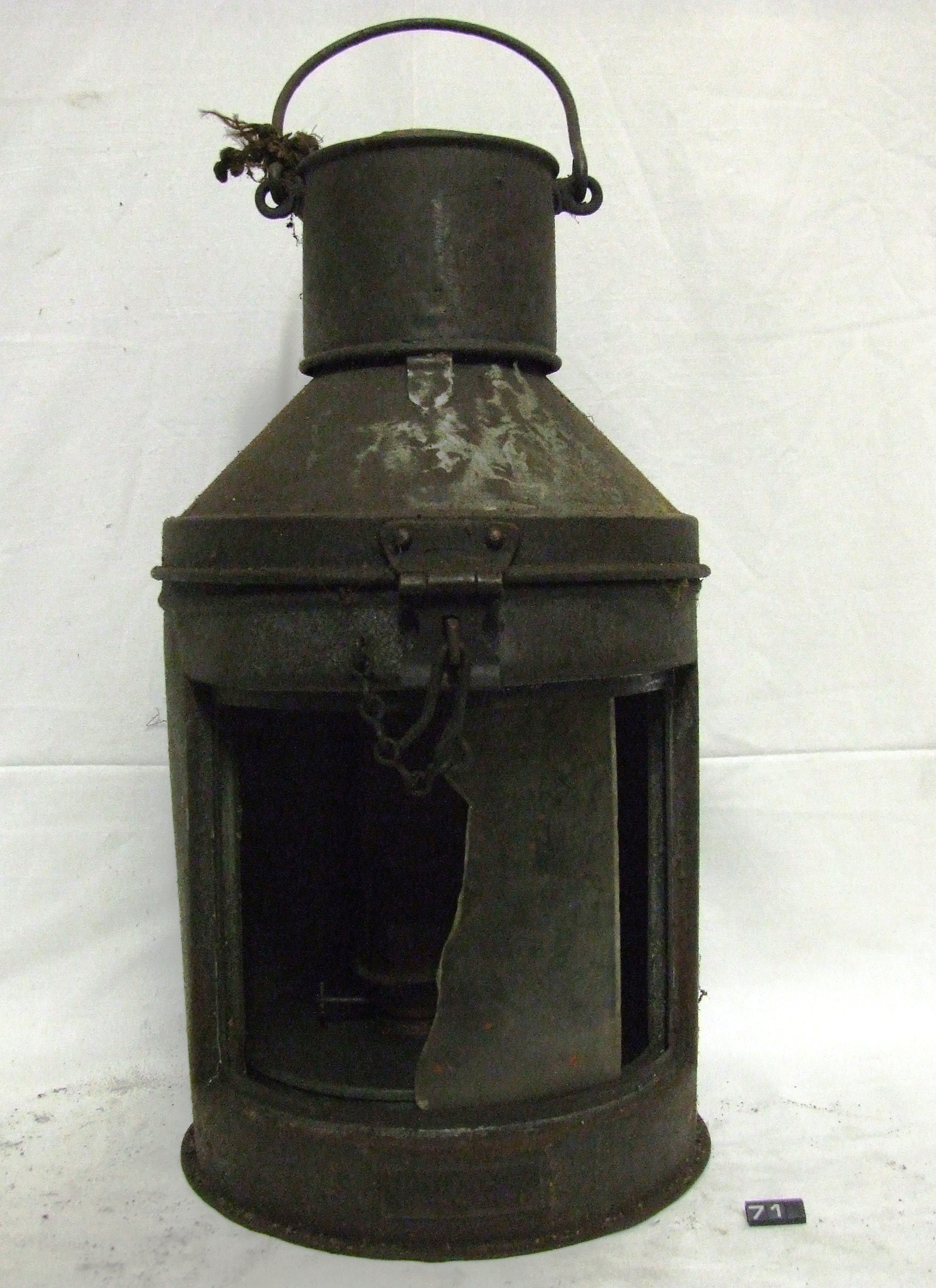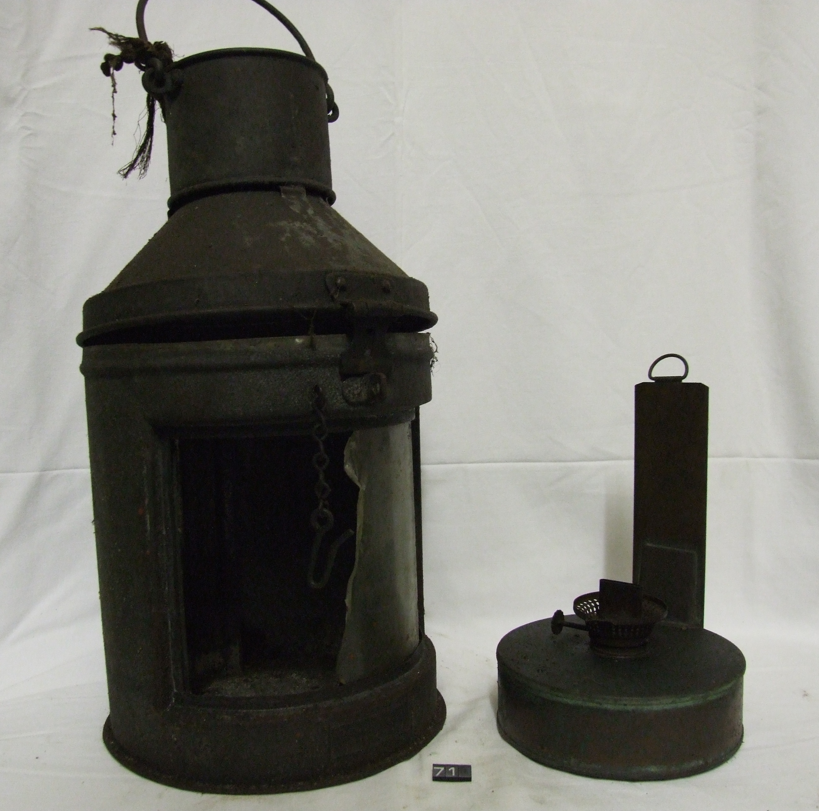 - DescriptionLarge marine masthead oil lamp; galvanised steel cylindrical body with hinged top; damaged colourless glass window; soldered copper reservoir with 1" type burner; Norris collection.