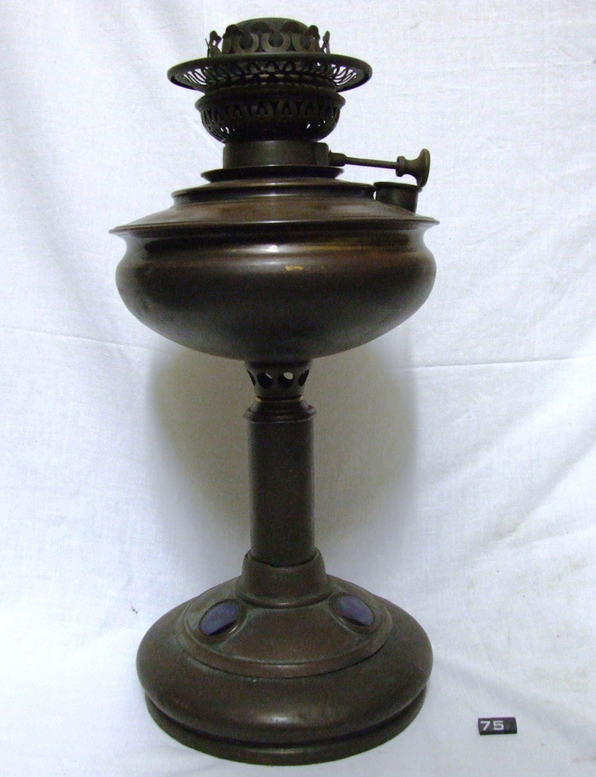 - DescriptionOil lamp; table lamp; copper base, plain cylindrical column, copper fount with screw cap filler; 3 dark blue ceramic discs set onto base for decoration; cast iron baseplate; 50cp centre draught burner by veritas; some minor damage, and some internal replacement parts formed out of metal polish tins; Norris collection.