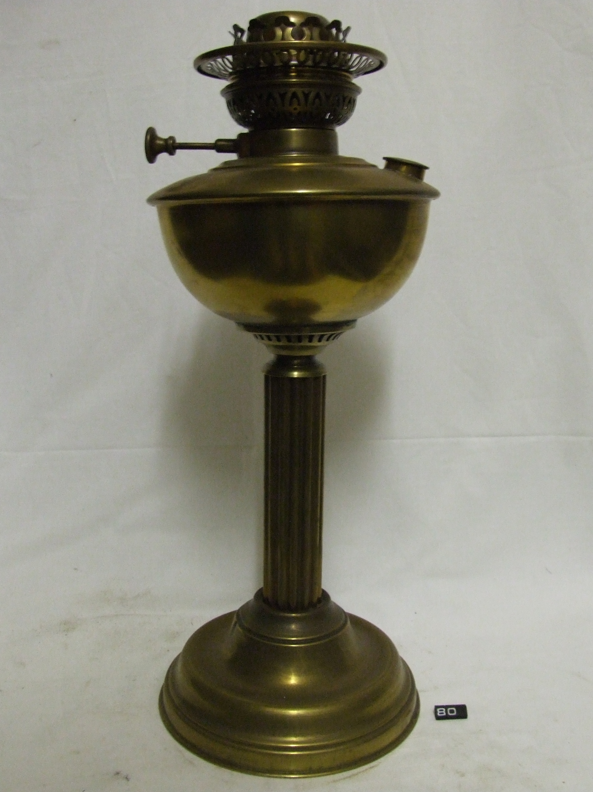 - DescriptionOil lamp; table lamp; spun brass pedestal & fluted brass column; spun brass fount with screw cap filler; Veritas 50 cp centre draught burner, with 100mm gallery; Norris collection.