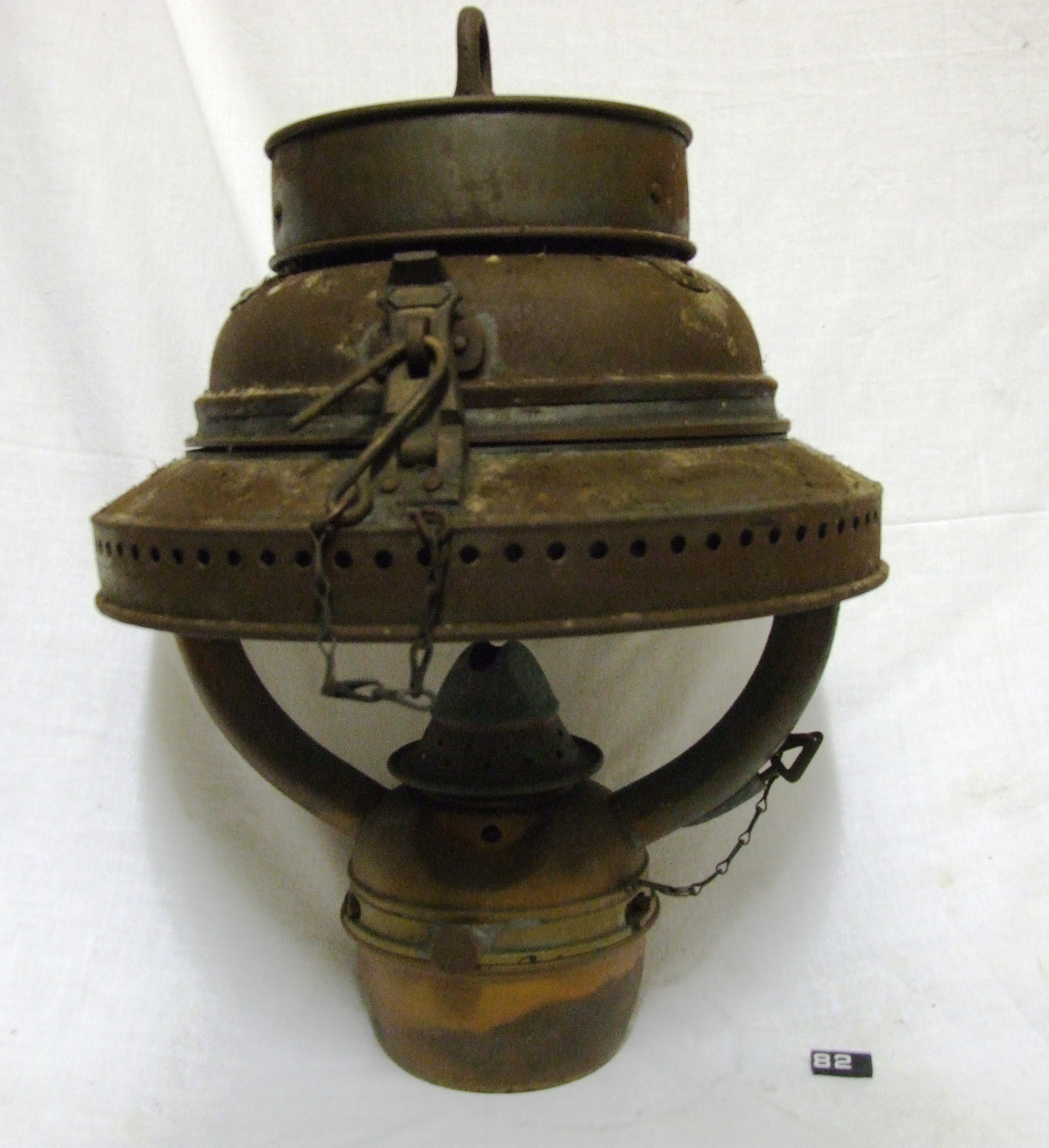 - DescriptionOil lamp; marine lamp; heavy steel Admiralty Pattern suspension lamp; single 1" nickel or chrome-plated burner; top is hinged to give access to chimney; bottom plate of top cover is enamelled white (to act as a reflector?); quite dirty & corroded; Norris collection.
