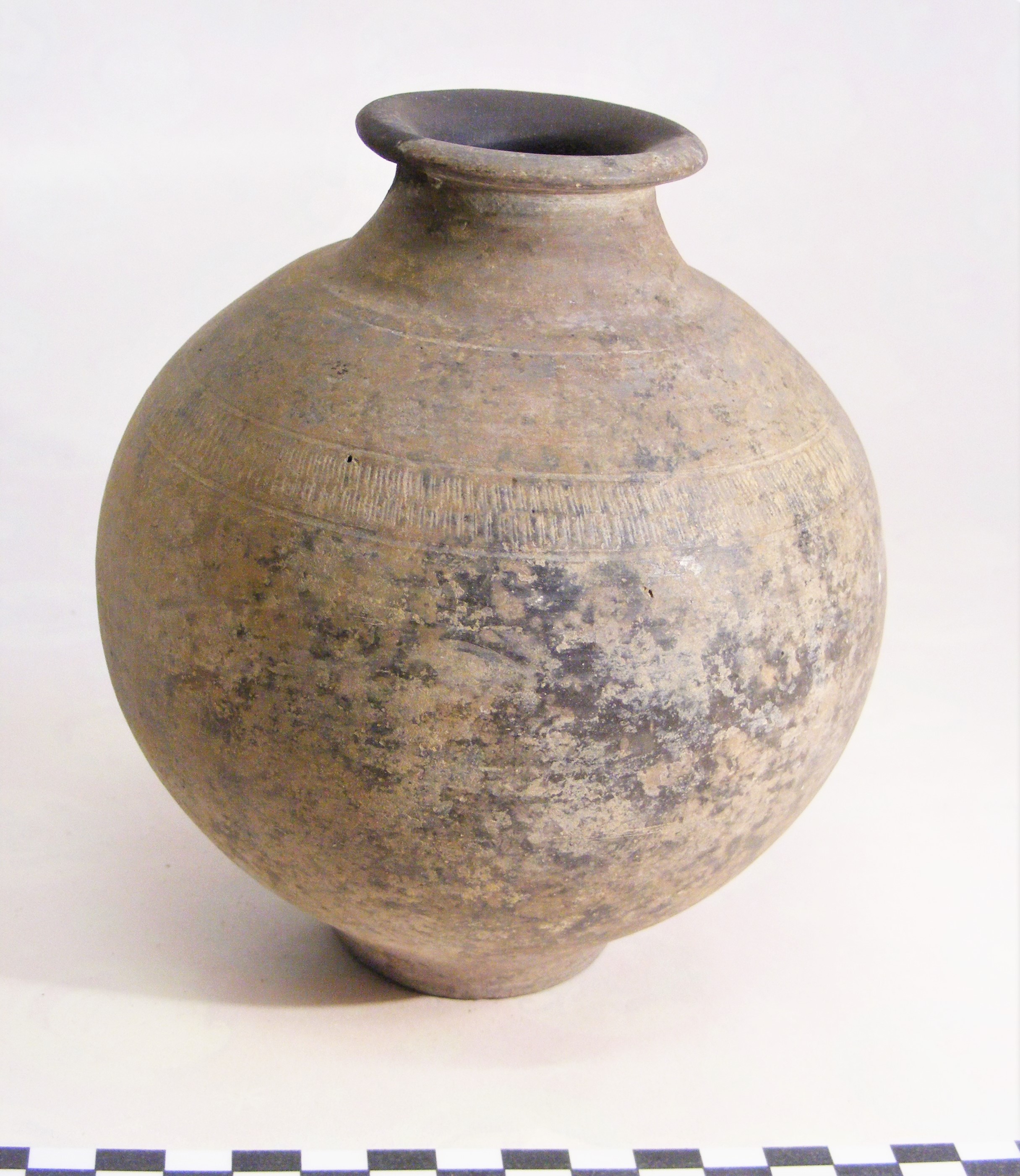 - DescriptionGrey ware bottle; pale grey fabric; wheel thrown; globular body, flat base; short neck with flattened rim, mostly broken away and replaced with plaster; band of rouletted decoration around upper half of body. Originally lent by T H Foord in 1906 - presumably bequeathed with other items at a later date.