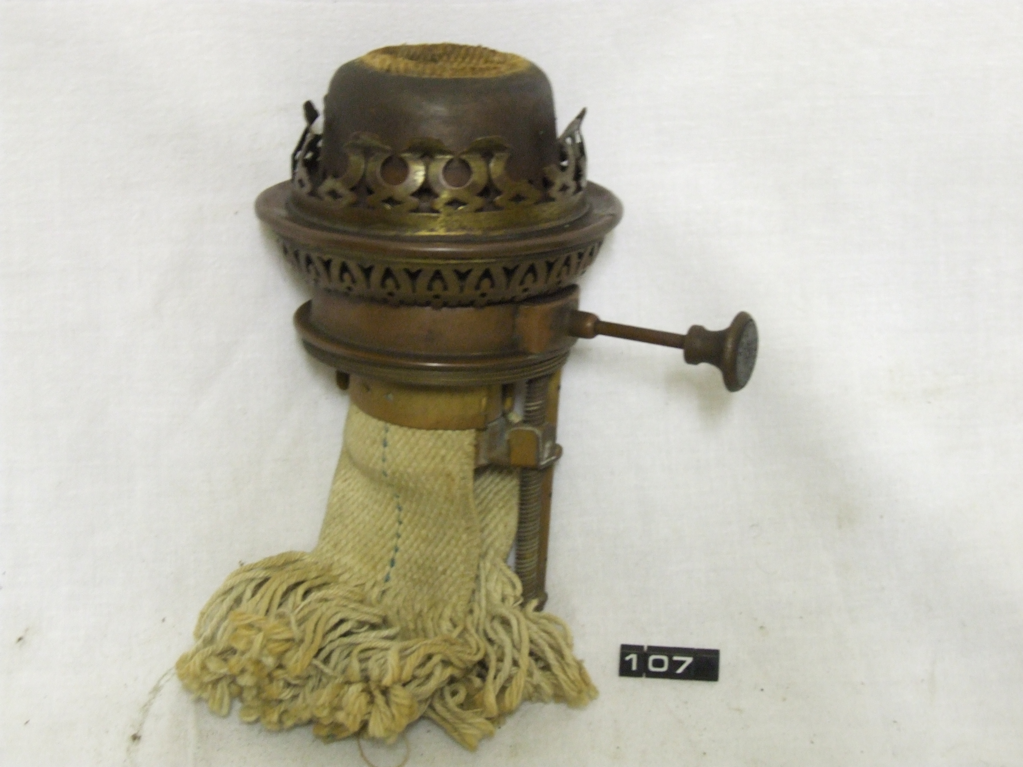 - DescriptionOil lamp burner; Veritas 100cp centre draught lamp burner; some damage to lower gallery; no flame spreader fitted; Norris collection.