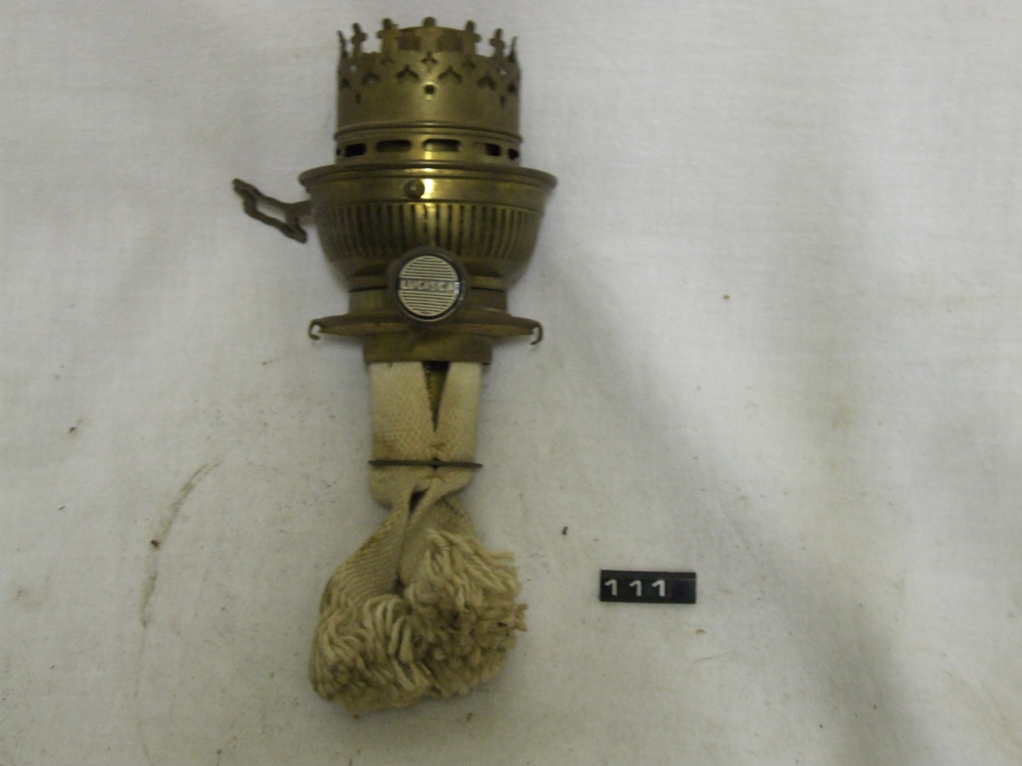 - DescriptionOil lamp burner; 'LUCISCA' centre draught lamp burner with 2" sconce; lifting mechanism for sconce; catch fitting on collar with cork washer; adjustable indicator on wick winder shaft; Norris collection.