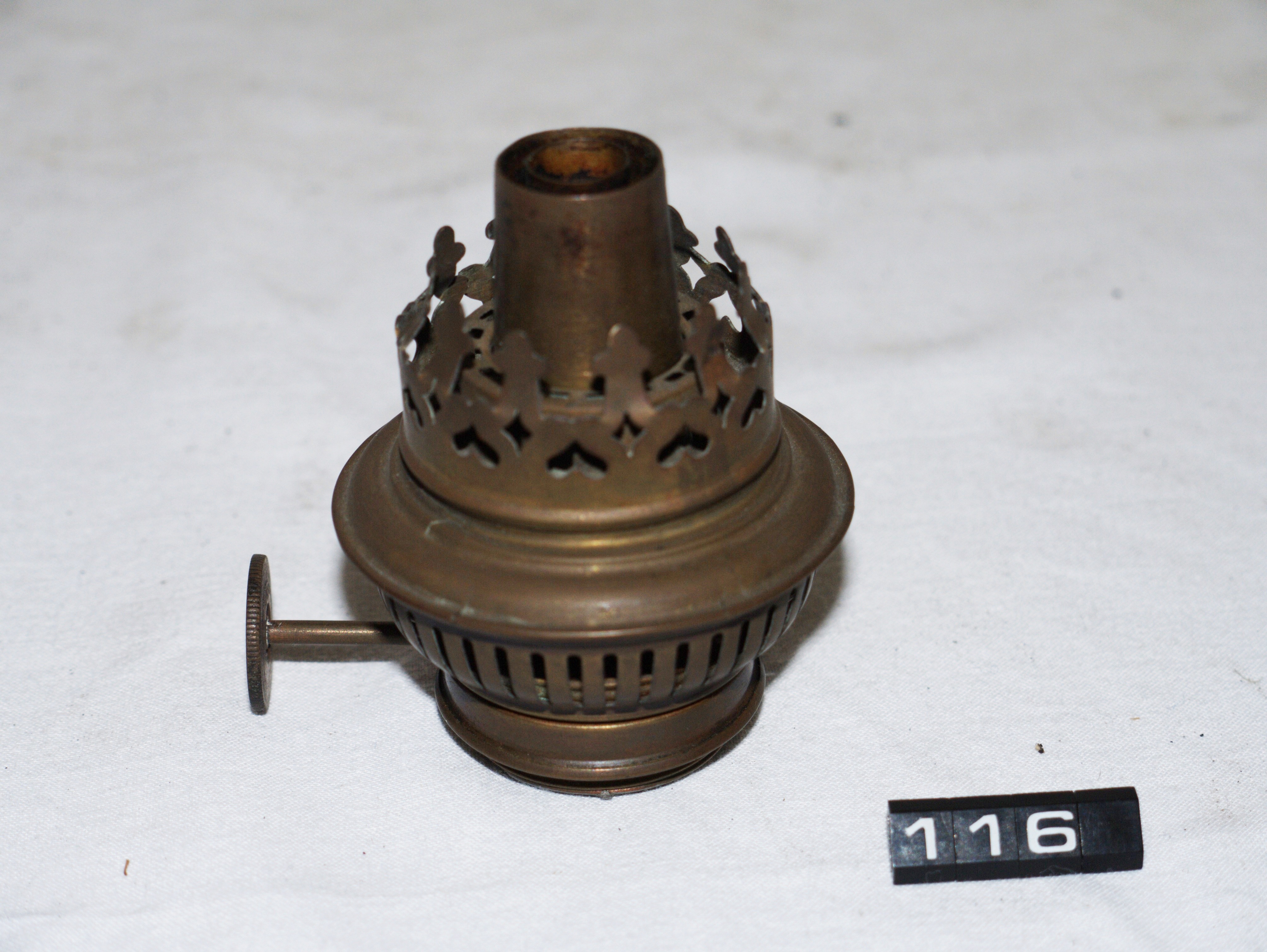 - DescriptionOil lamp burner; Kosmos 1⅞" centre draught lamp burner with 1½" sconce; no wick or flame spreader fitted; made circa 1875-1899; Norris collection.