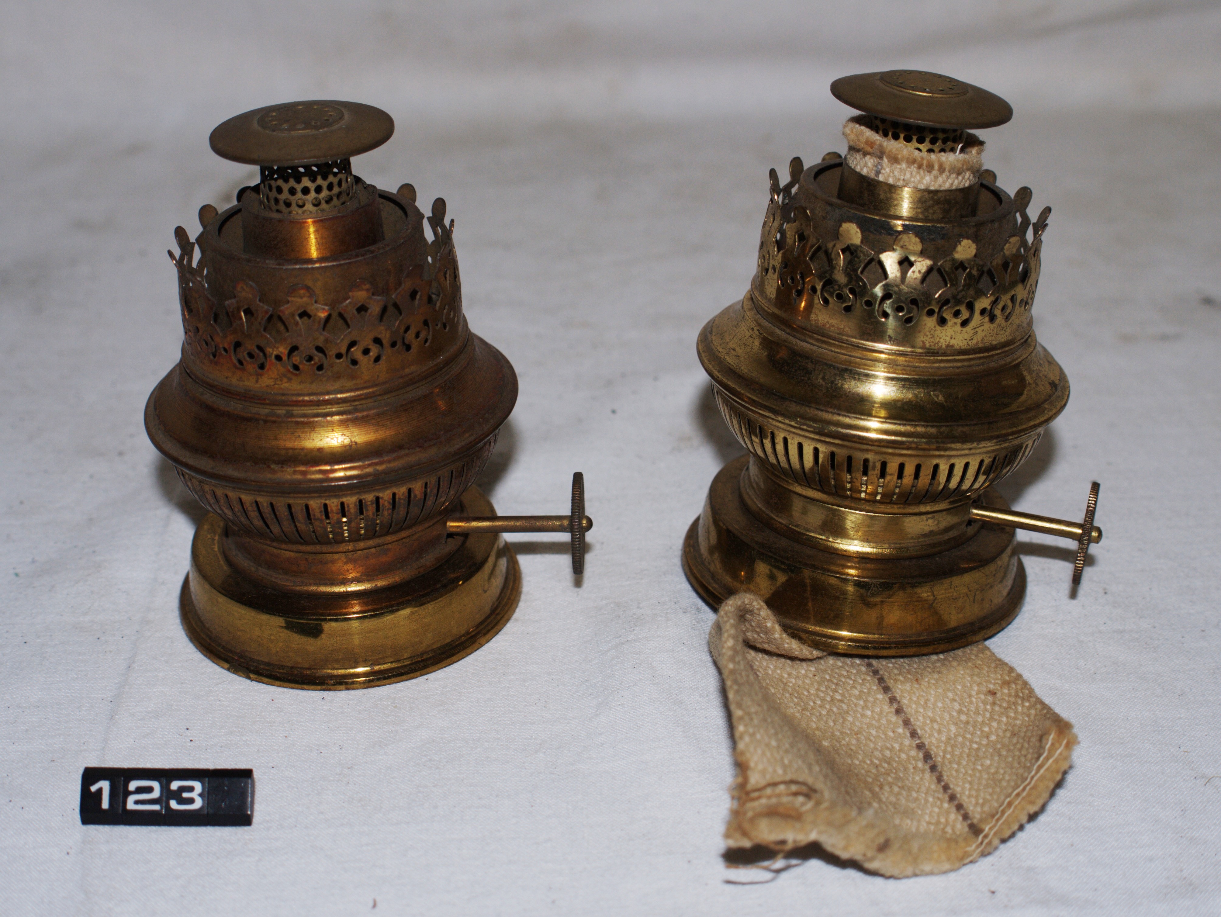 - DescriptionOil lamp burners; two 'Wizard' centre draught lamp burners, with 1⅞" sconce, 15"' line; wick fitted to one burner only; made in Germany by Carl Holy of Berlin; Norris collection.