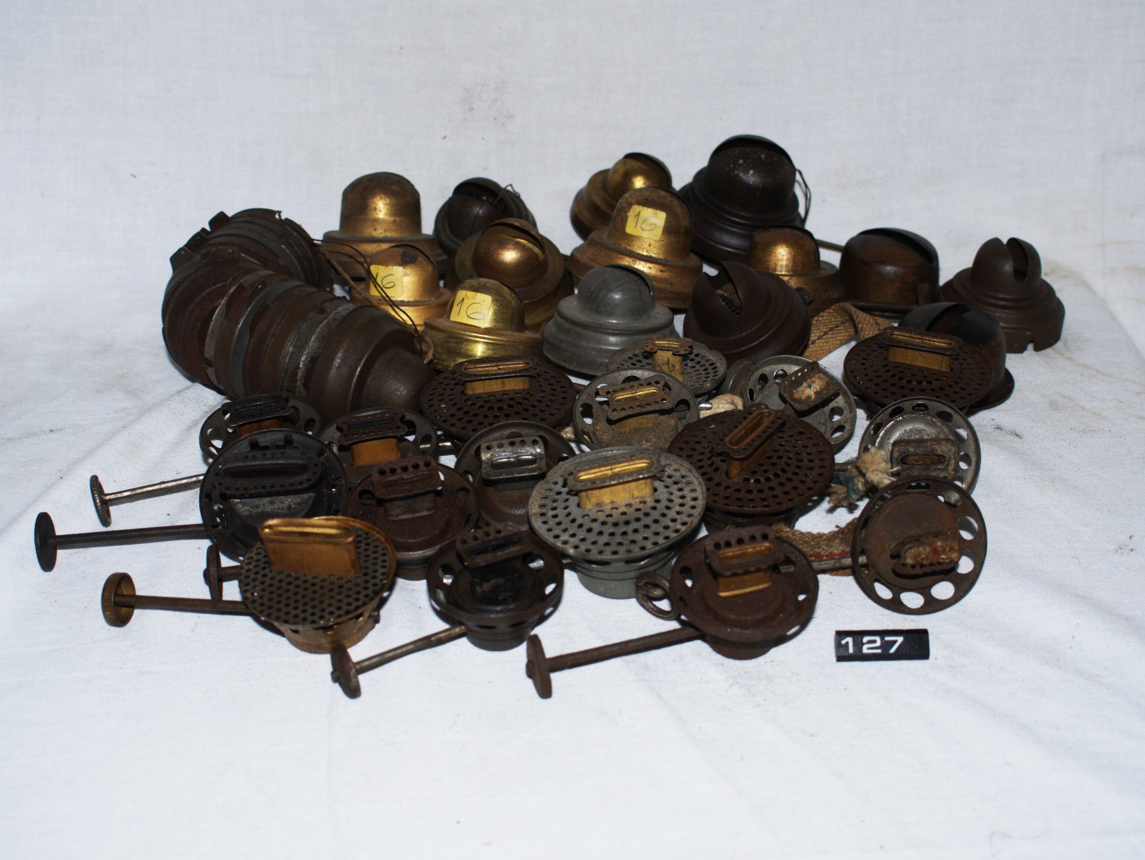 Oil lamp burners; 23 storm lamp burners, various makers & sizes, not all with wick fitted; Norris collection.