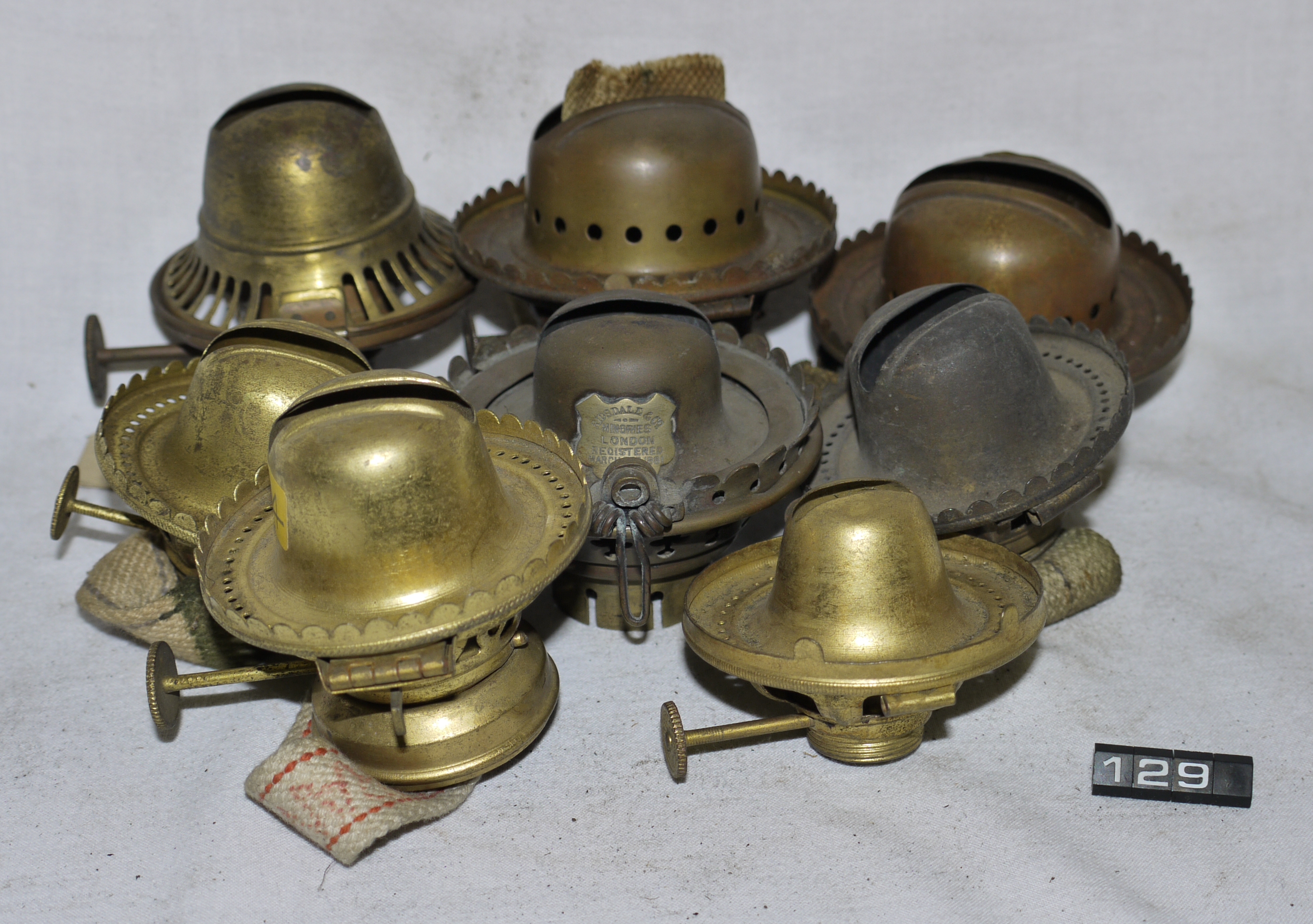 - DescriptionOil lamp burners; 8 hinged burners, various makers (Ridsdale & Co, Miller, Sherwoods), sizes up to 1½"; 8 examples out of 10 on the Norris listing; Norris collection.