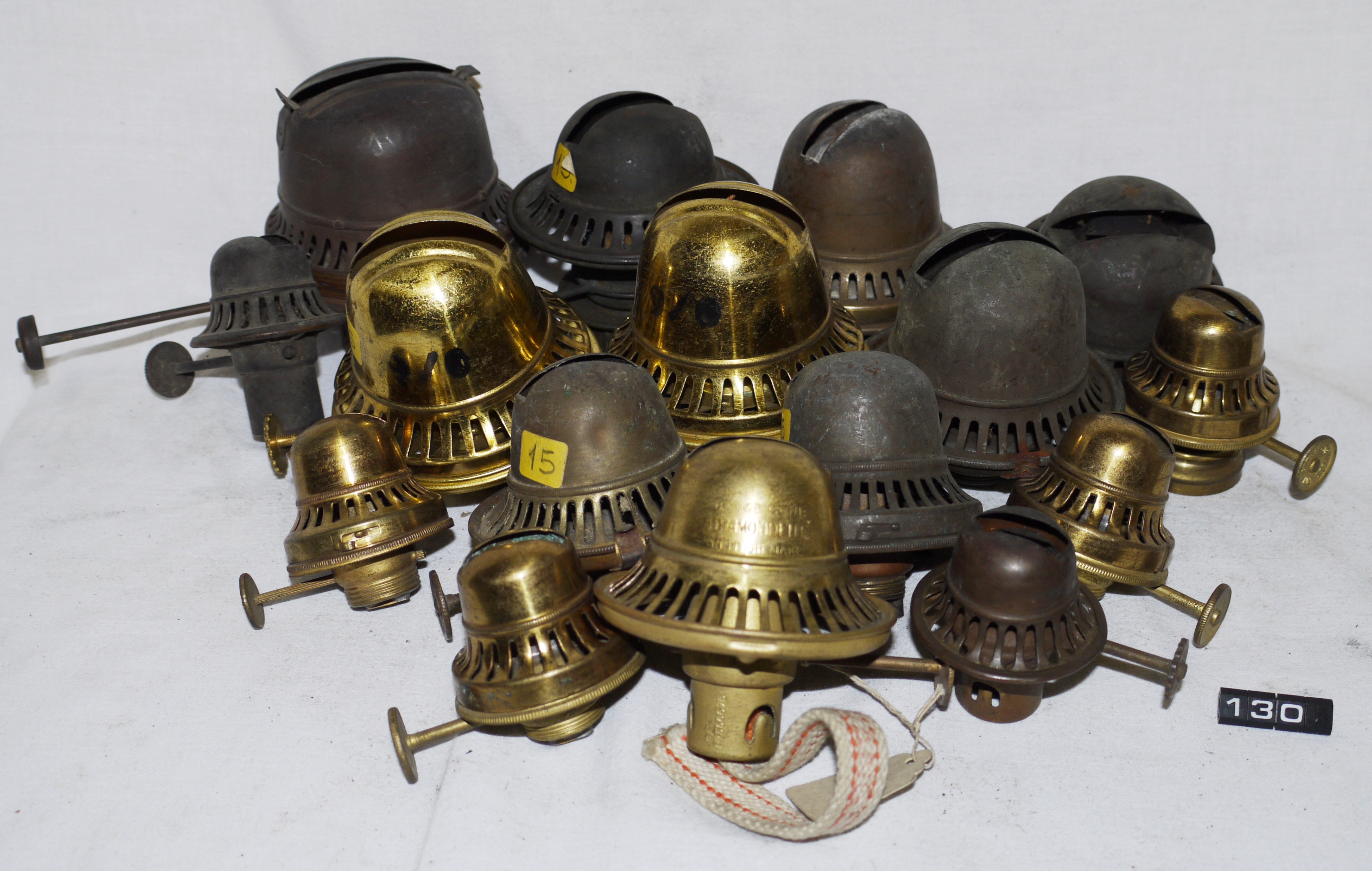 - DescriptionOil lamp burners; 16 cone type burners, various makers, sizes up to 1½"; 16 examples, though only 7 recorded on the Norris listing; Norris collection.