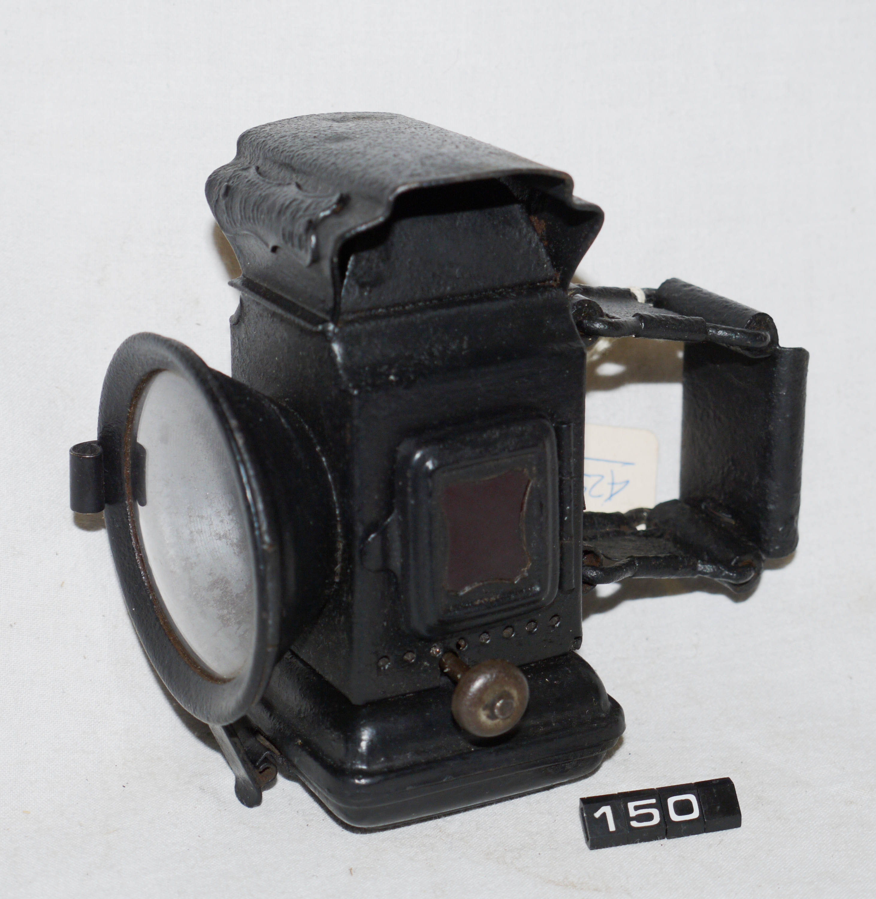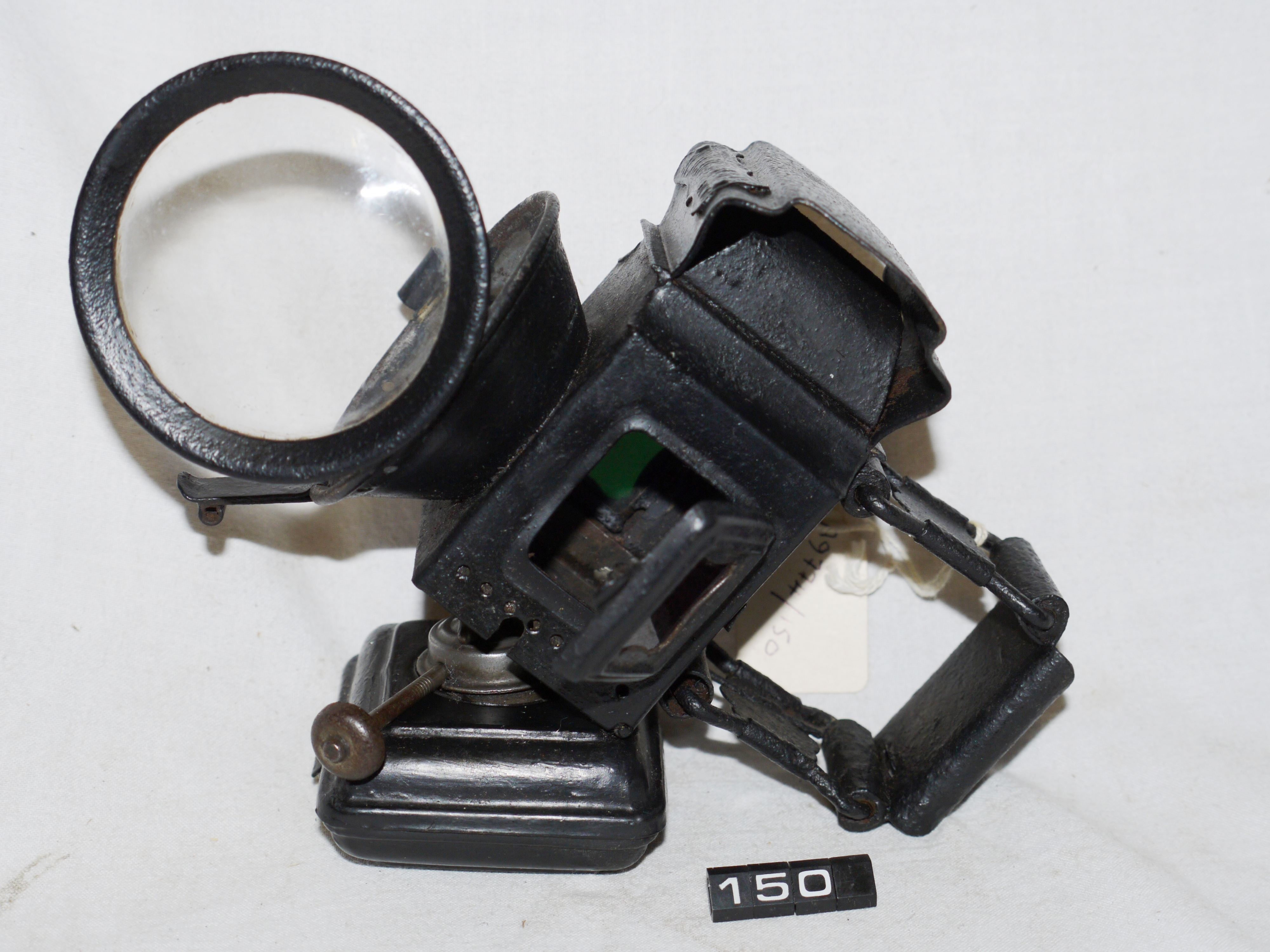 - DescriptionOil lamp for a bicycle; Miller 'LUMO' front cycle lamp; square body with hinged side door, black japanned finish; clear glass front & ruby lens on left side & green on the right; colza (vegetable oil) burner; Norris collection.