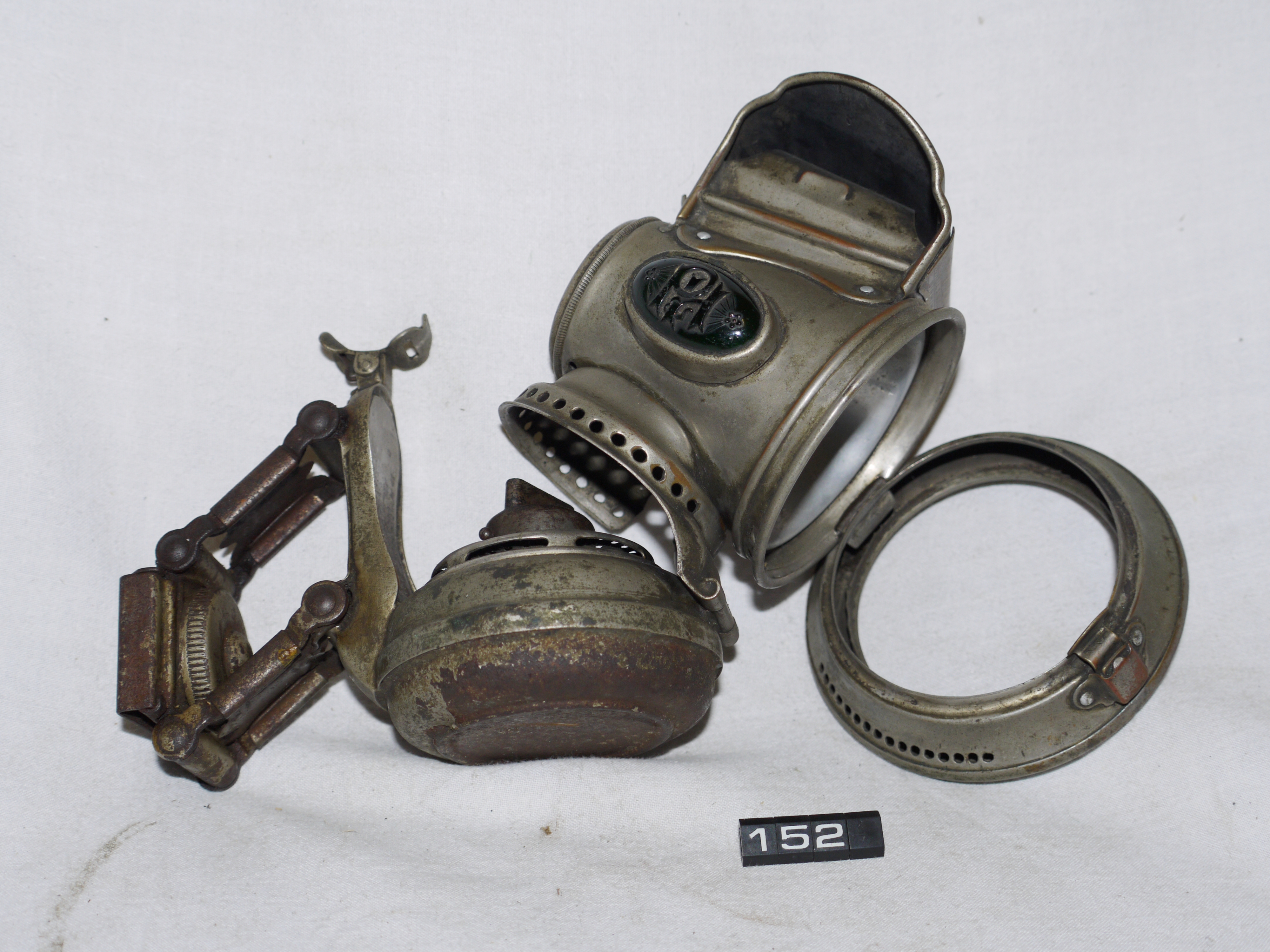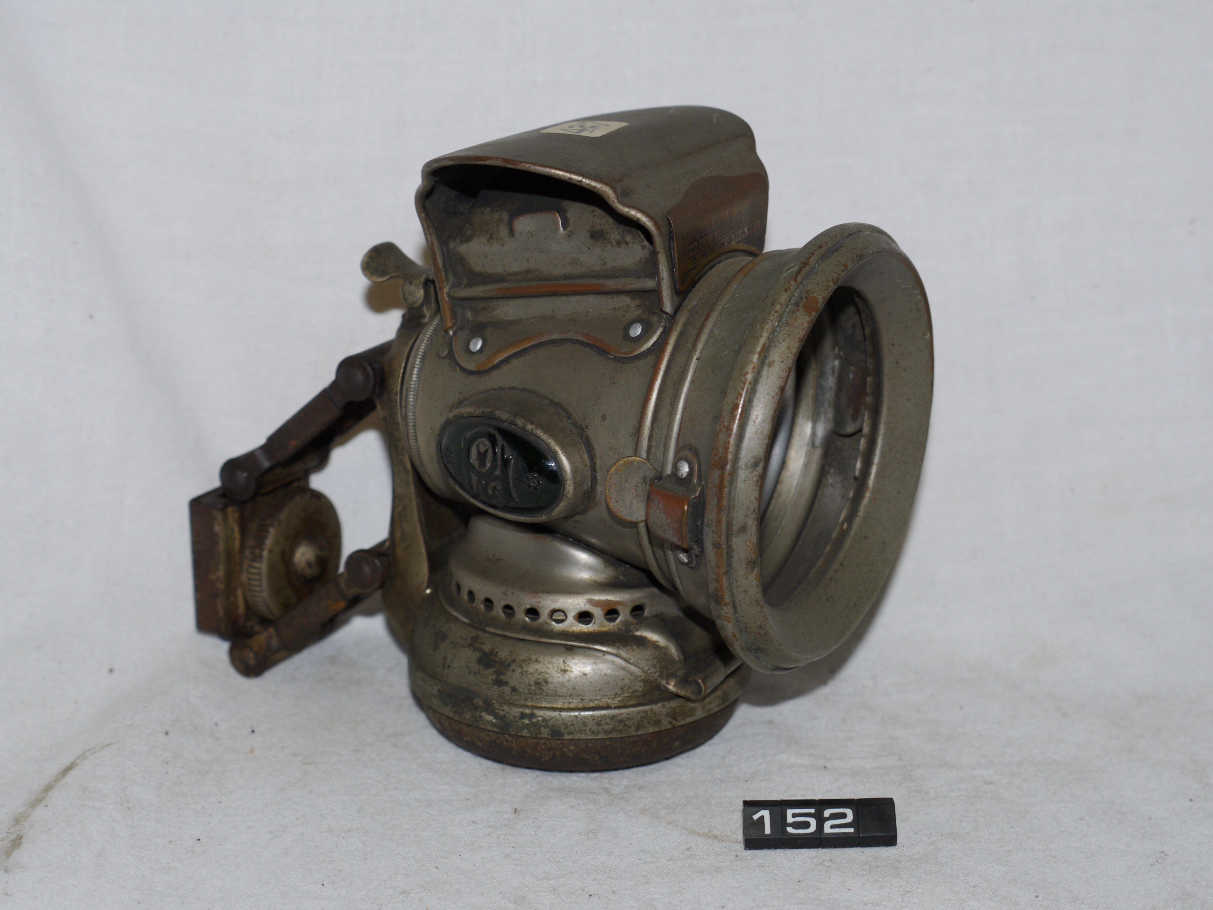 - DescriptionOil lamp for a bicycle; Powell & Hamner 'HOROSCOPE' front cycle lamp; truncated conical plated brass body with hinged front lens (glass missing); red & green glass lozenges on the sides with 'P & H' logo; colza (vegetable oil) burner; tinplate burner is quite corroded; Norris collection.