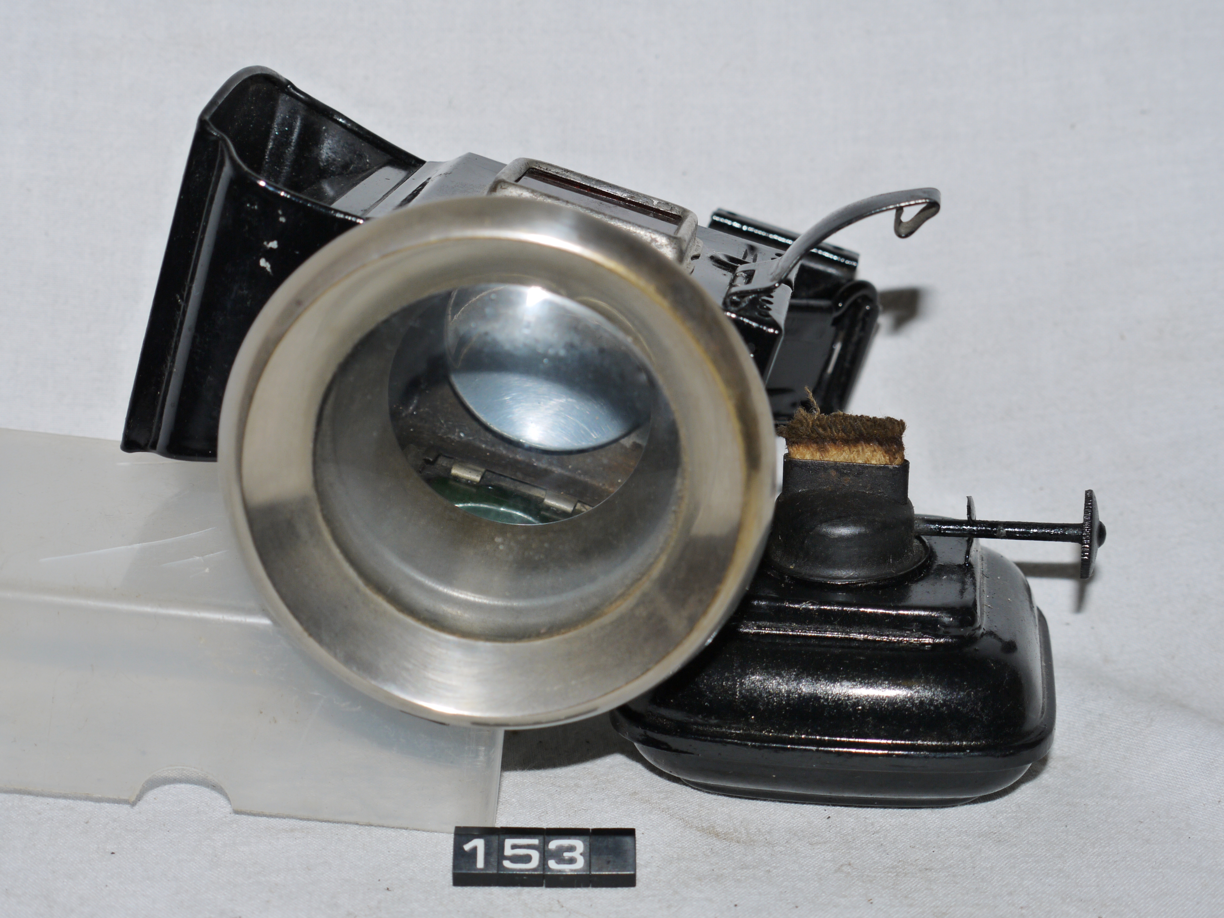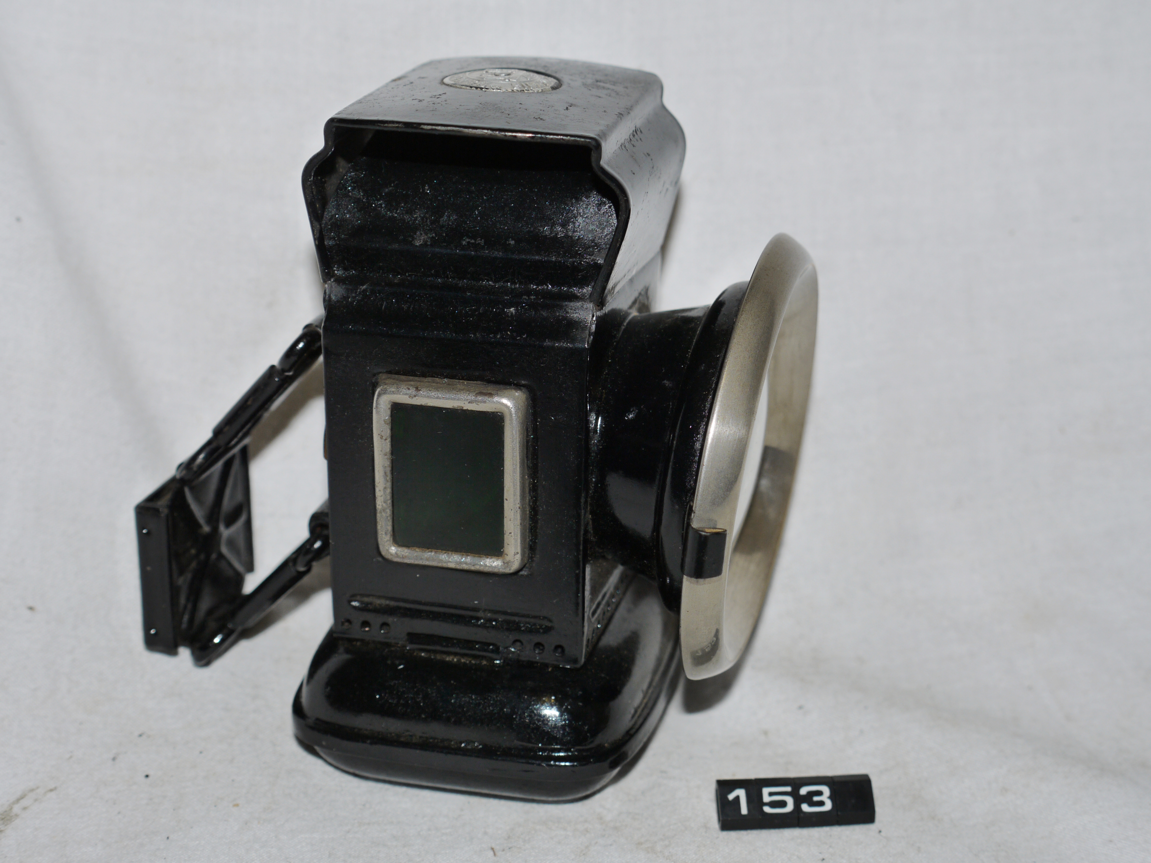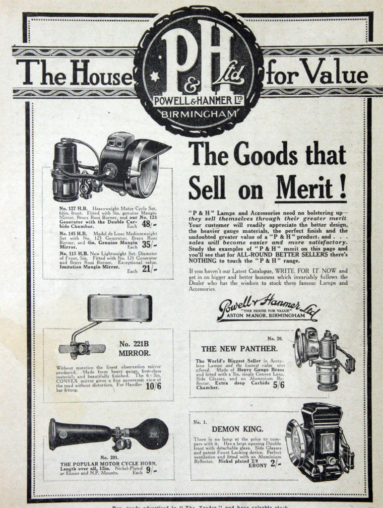 Oil lamp for a bicycle; Powell & Hamner 'DEMON KING' front cycle lamp; clear glass hinged front lens; hinged access door with red glass on the left, green glass to the right; nickel-plated? front lens holder, polished steel reflector; the lamp has been restored; third attached image is a page from Grace's Guide for March 1925, showing this lamp for 2/-; Norris collection.
