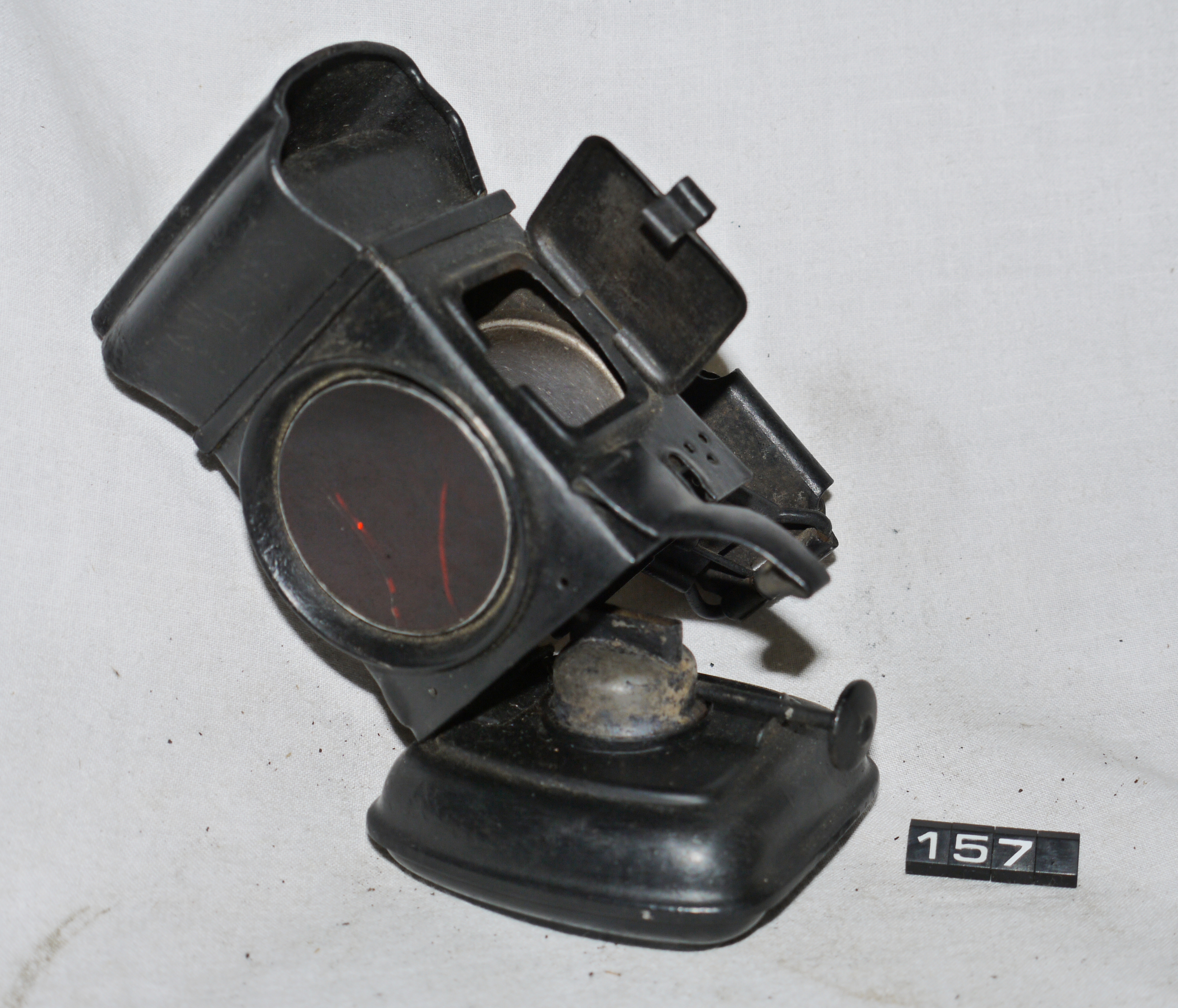 - DescriptionOil lamp for a bicycle; Lucas rear cycle lamp; square body with hinged side door; ruby lens (cracked); body hinged on reservoir; polished steel reflector; lamp has been restored; colza (vegetable oil) burner; Norris collection.