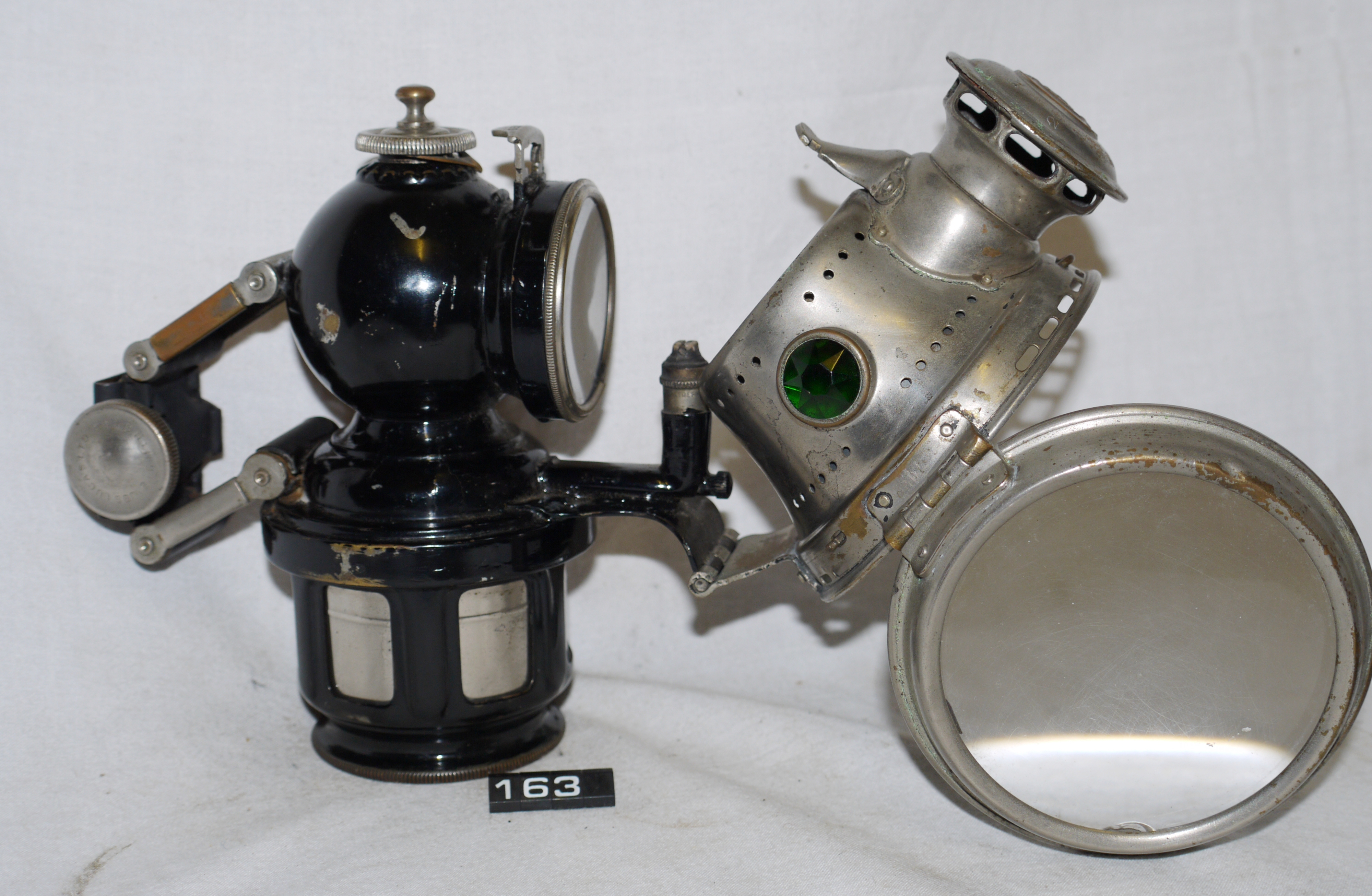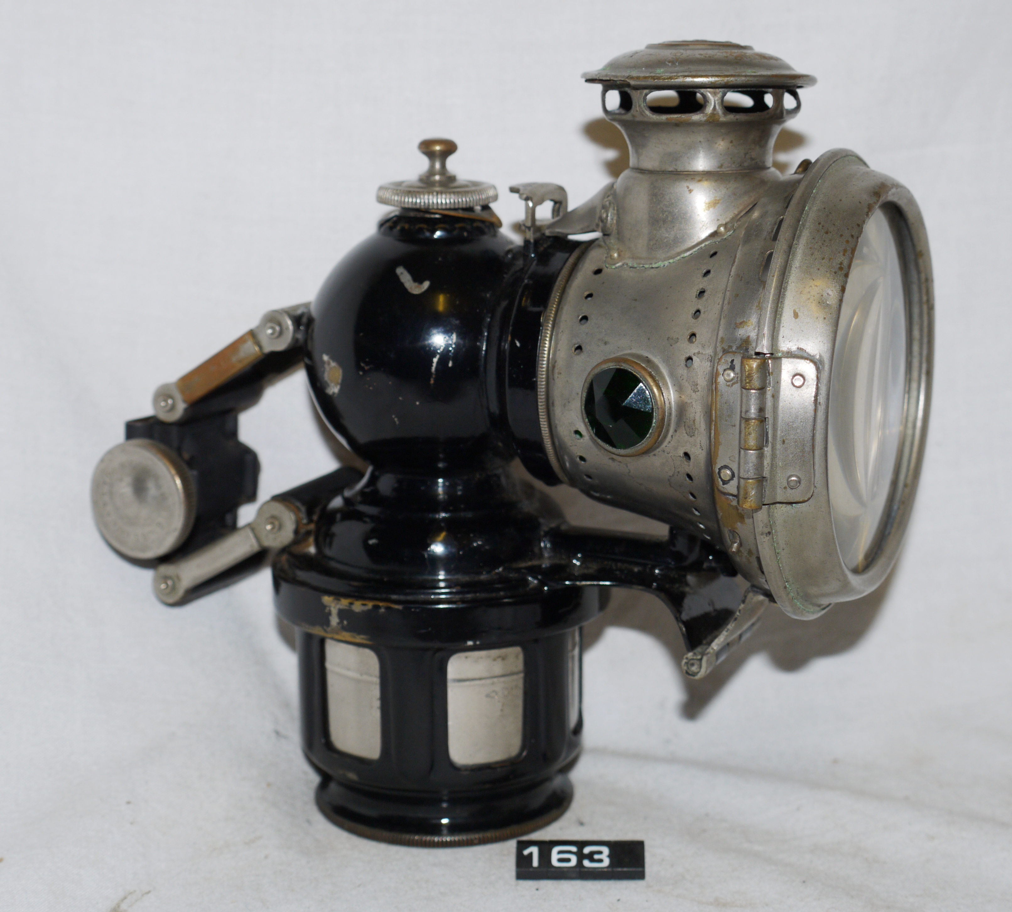 - DescriptionGas lamp for a bicycle; Lucas 'KORA' (acronym for 'King of the Road Acetylene') acetylene front cycle lamp; hinged clear glass lens; faceted green glass lens on right side of body, red on the left; polished steel reflector; burner housing hinged at bottom; Norris collection.