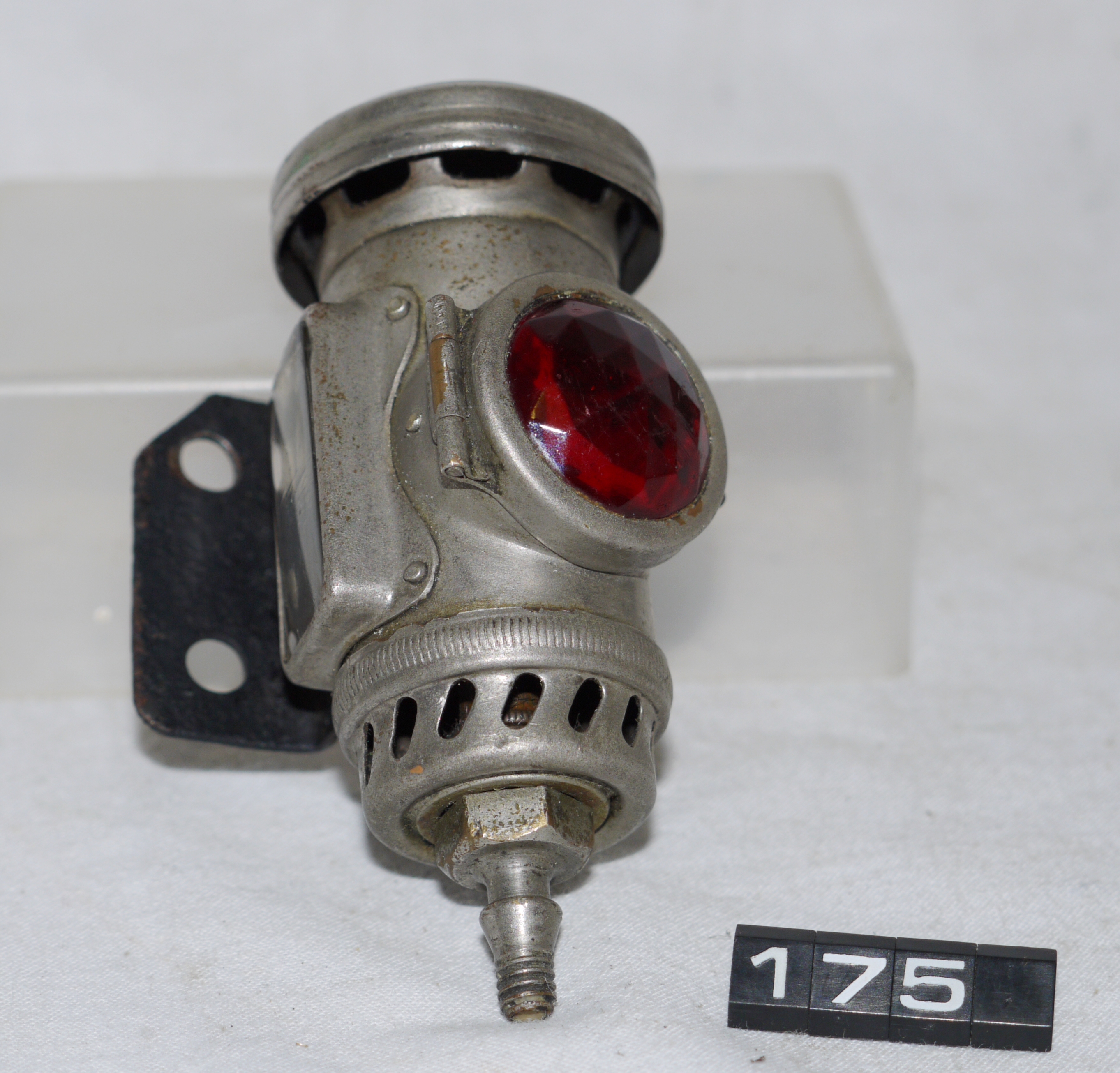 Oil lamp for a bicycle or motorcycle; Lucas 'No 344' rear lamp; tubular body with red faceted glass lens & clear glass lens on side of body; carbide burner, adaptor in base for carbide supply; the bracket with two screw holes for permanent fixing, together with the clear glass side panel (possibly for illuminating a number plate) suggests use on a motorcycle or car, rather than a bicycle; Norris collection.