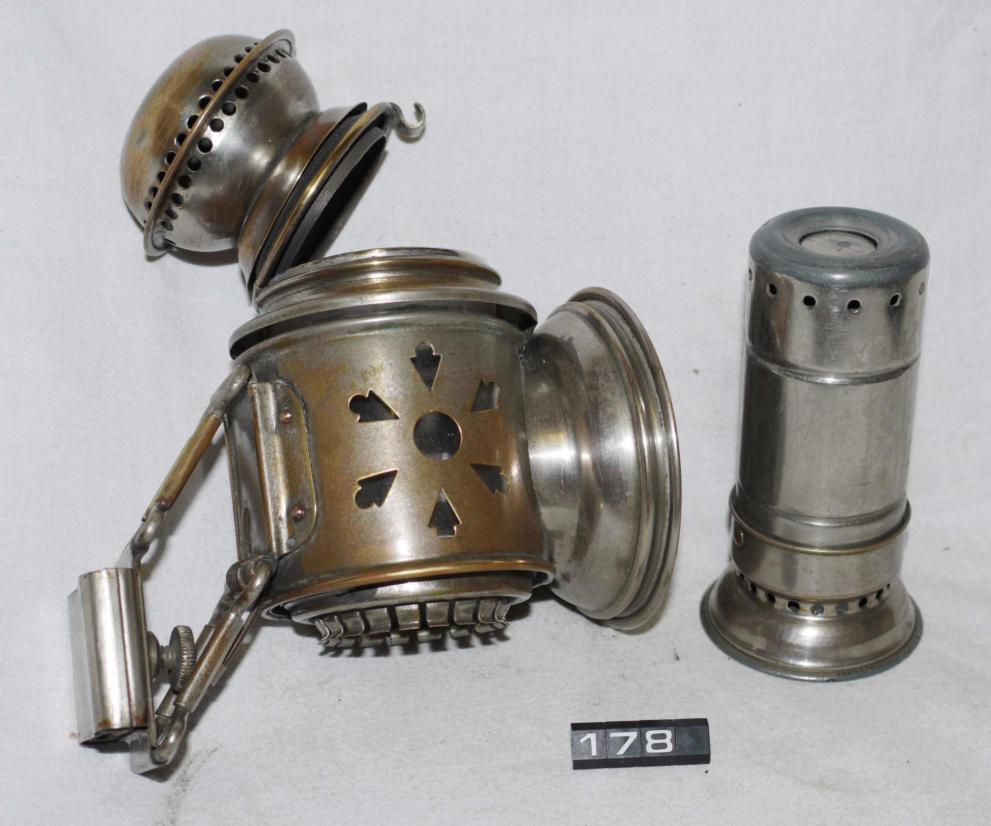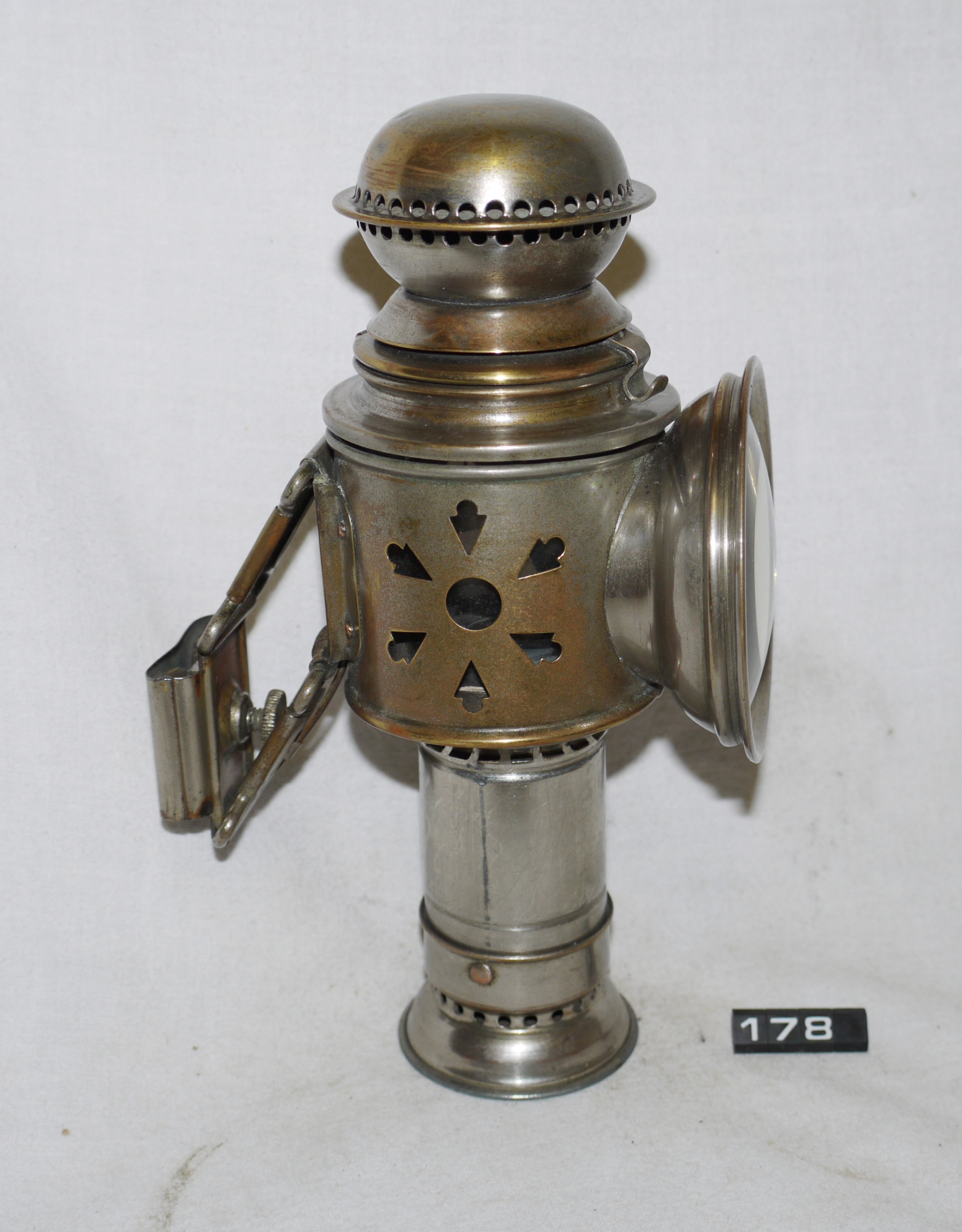 - DescriptionOil lamp for a bicycle; O F Asp of Copenhagen, front cycle lamp; tubular body with a hinged domed chimney; convex clear glass lens; inside is a tubular spring-loaded candle holder; Norris collection.